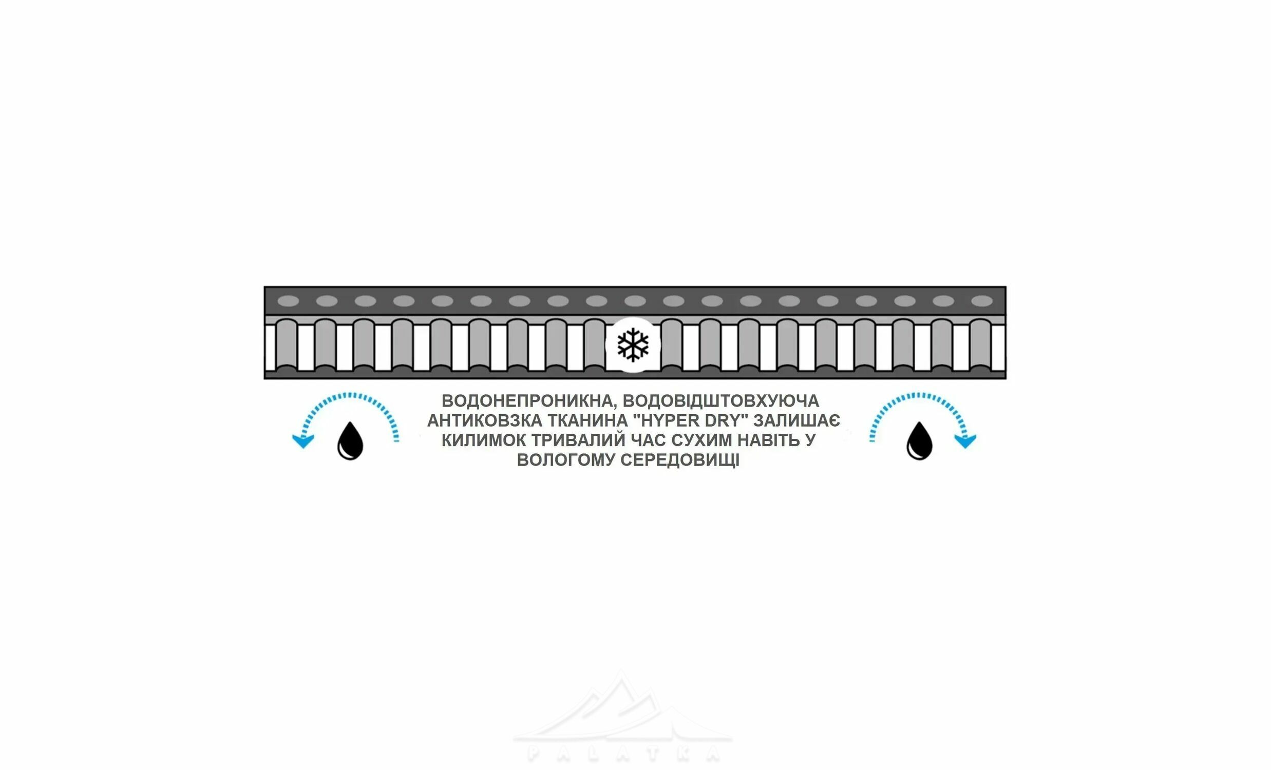 - Суцільна перфорація наповнювача зменшує вагу килимка без втрати пружності й теплоізоляції.