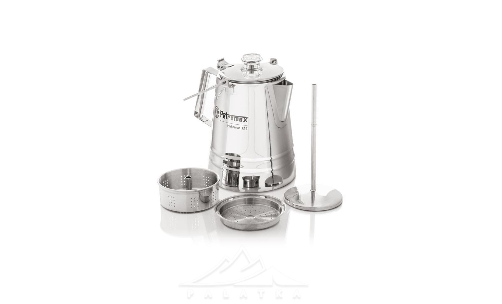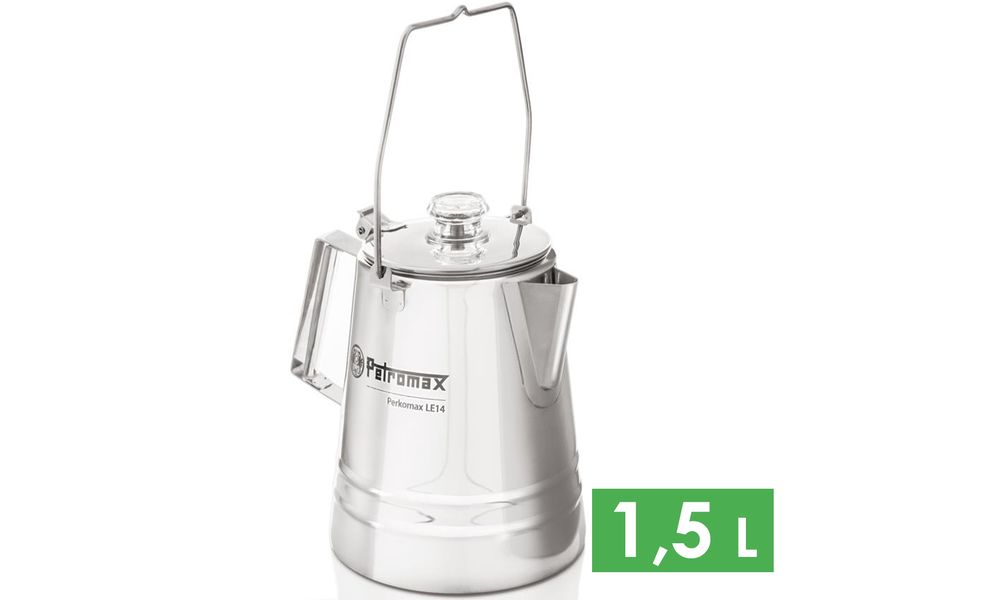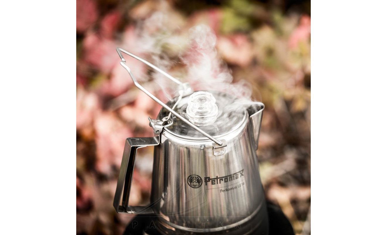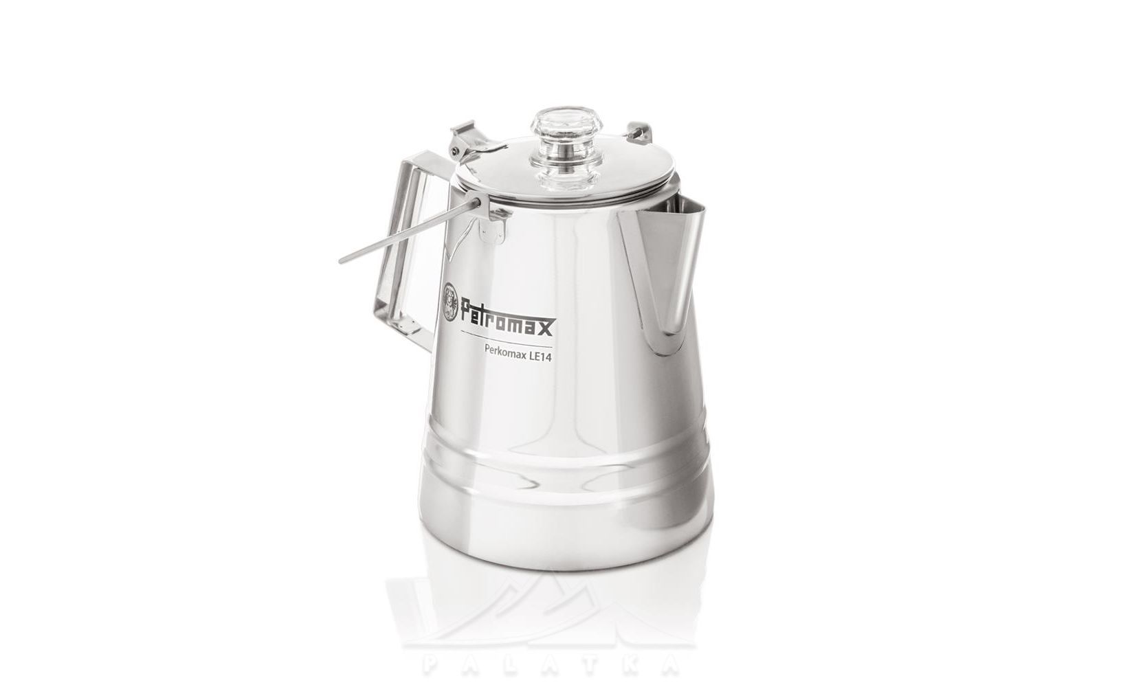 Кавоварка-перколятор Petromax Percolator Perkomax — кавоварка з термостійкої нержавіючої сталі та петлеподібною ручкою, яка працює за принципом гейзера. Універсальний варіант для кемпінгу, активного відпочинку на природі (можна підвісити над вогнищем) або використовувати вдома на електричній або газовій плиті. Дозволяє заварювати каву або чай з насиченим та збалансованим смаком.