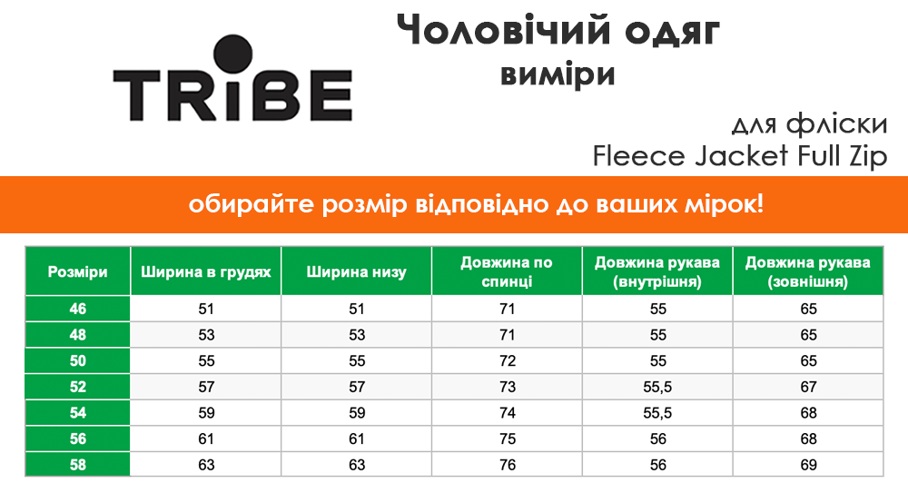 таблиця розмірів чоловічої фліски Tribe Fleece Jacket Full Zip