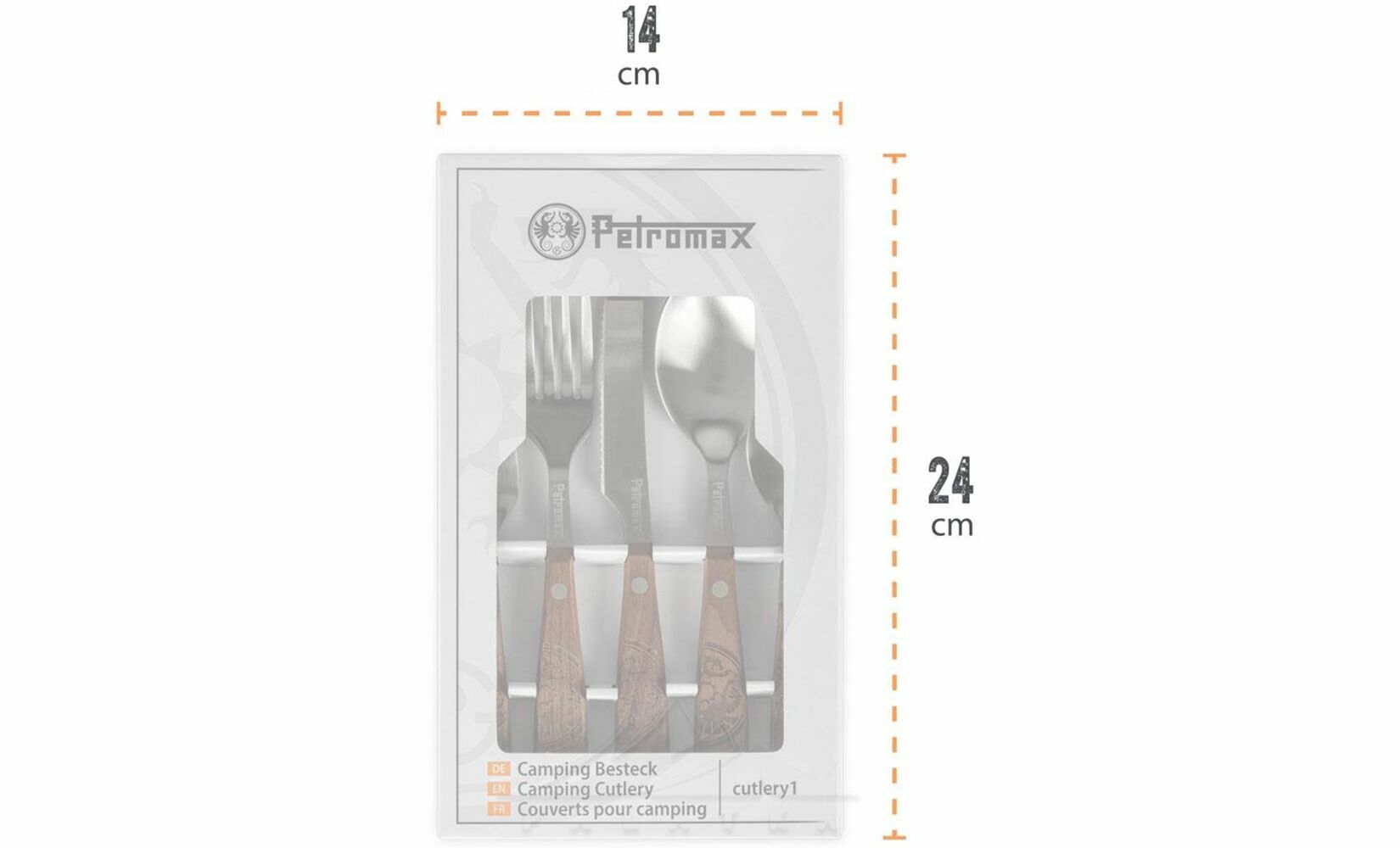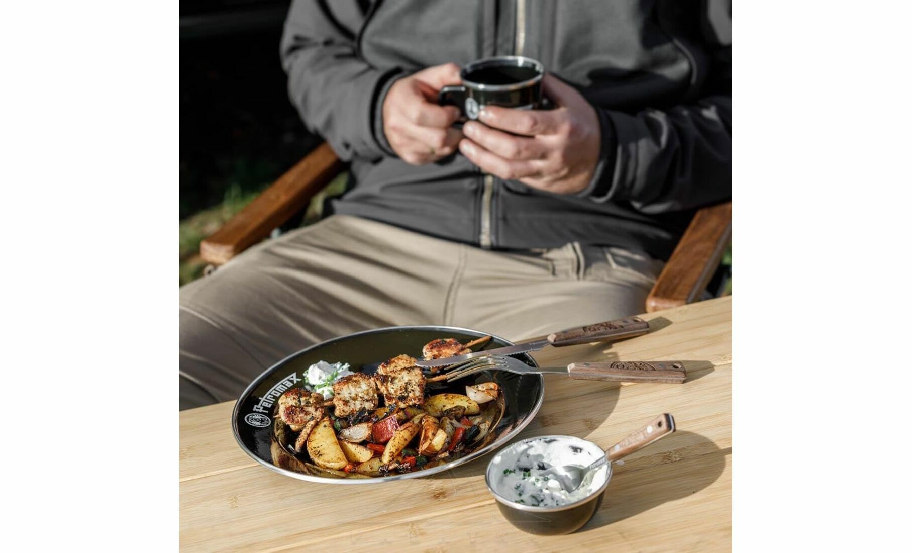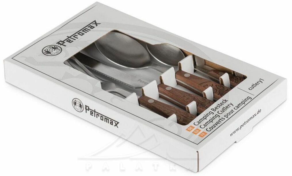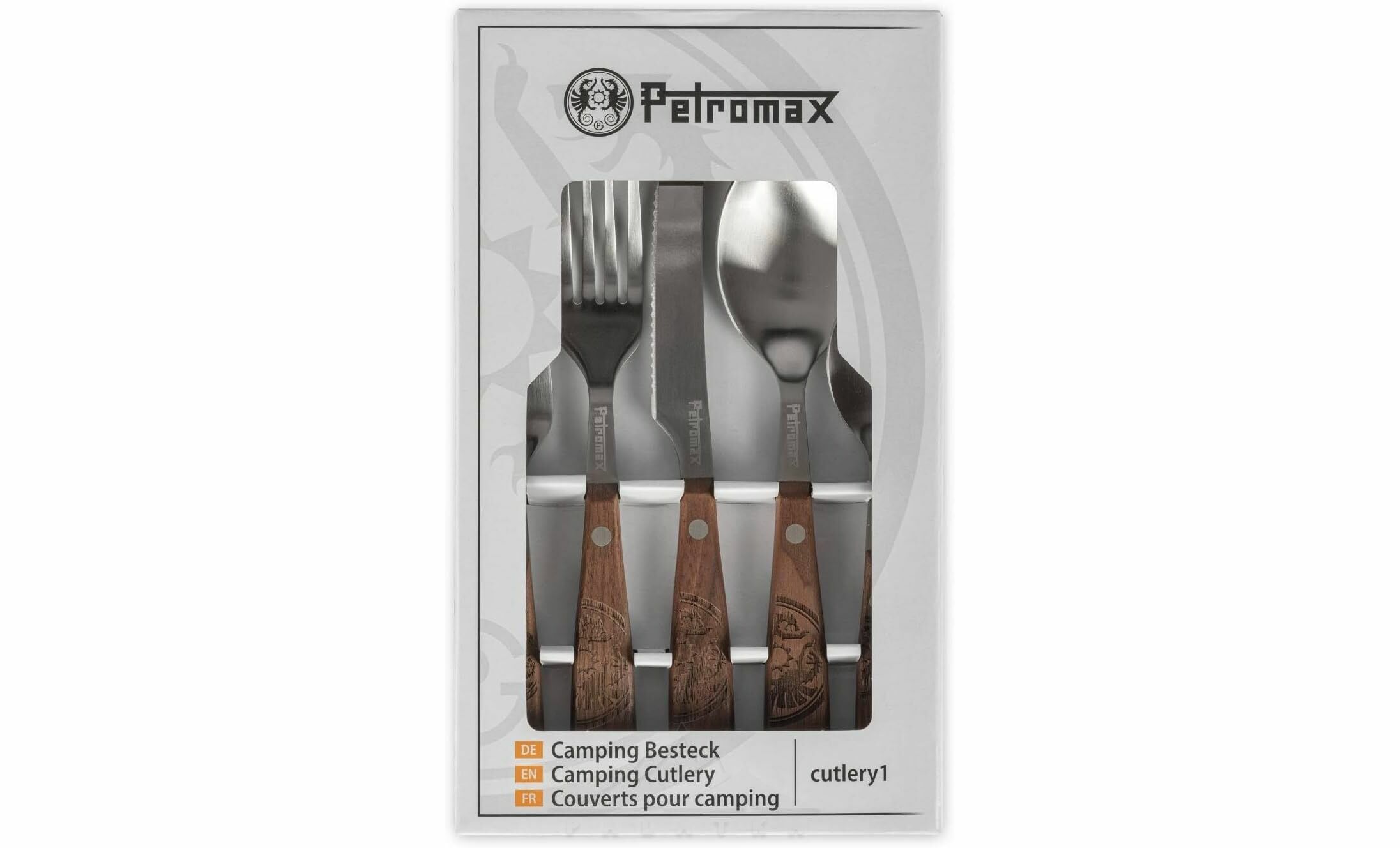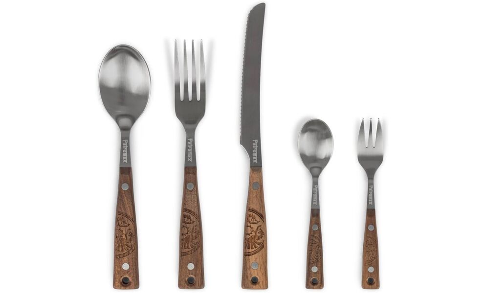 Petromax Camping Cutlery — практичний базовий набір столових приборів, виготовлений з матової нержавіючої сталі та горіхового дерева. Розрахований на дві особи.