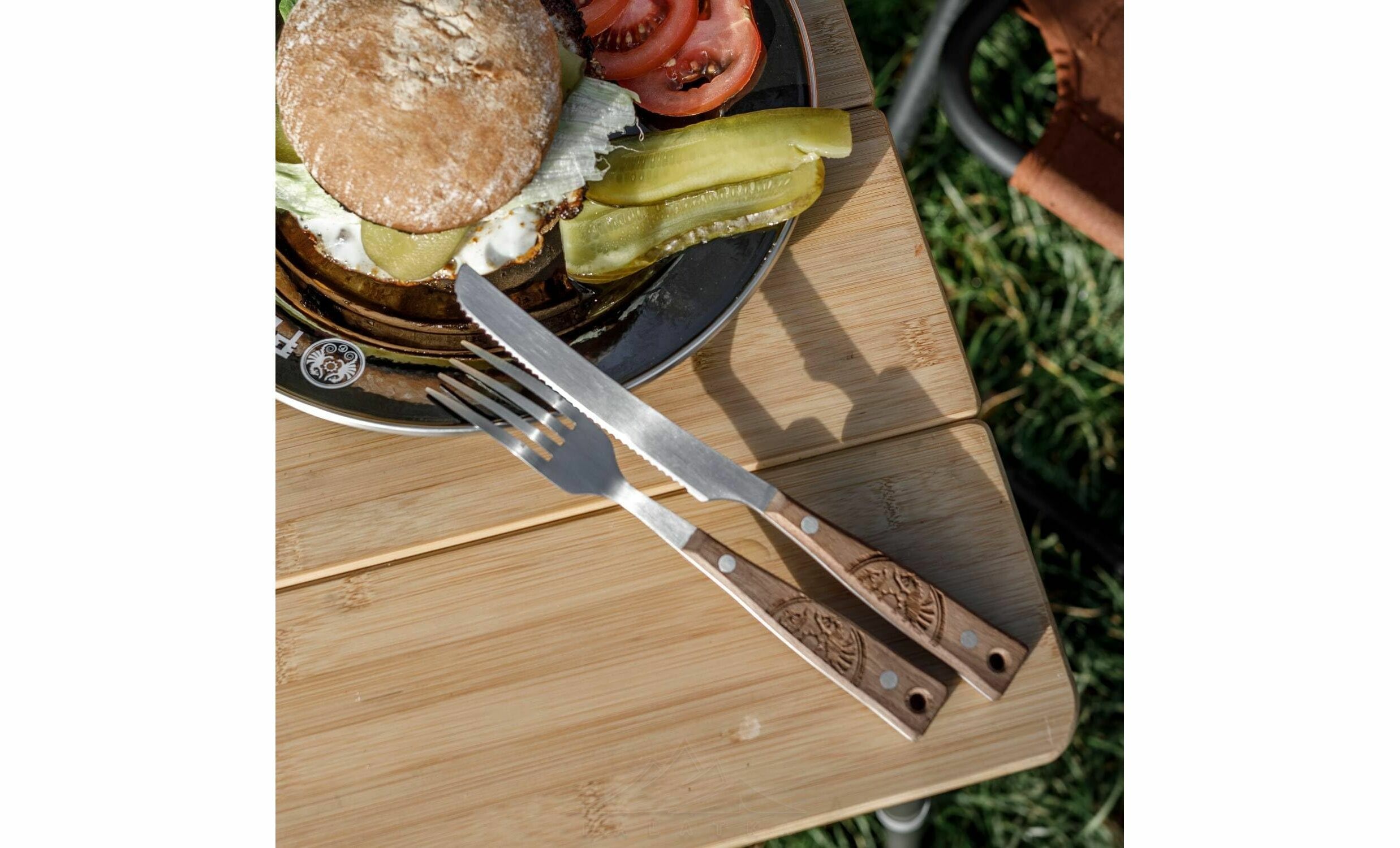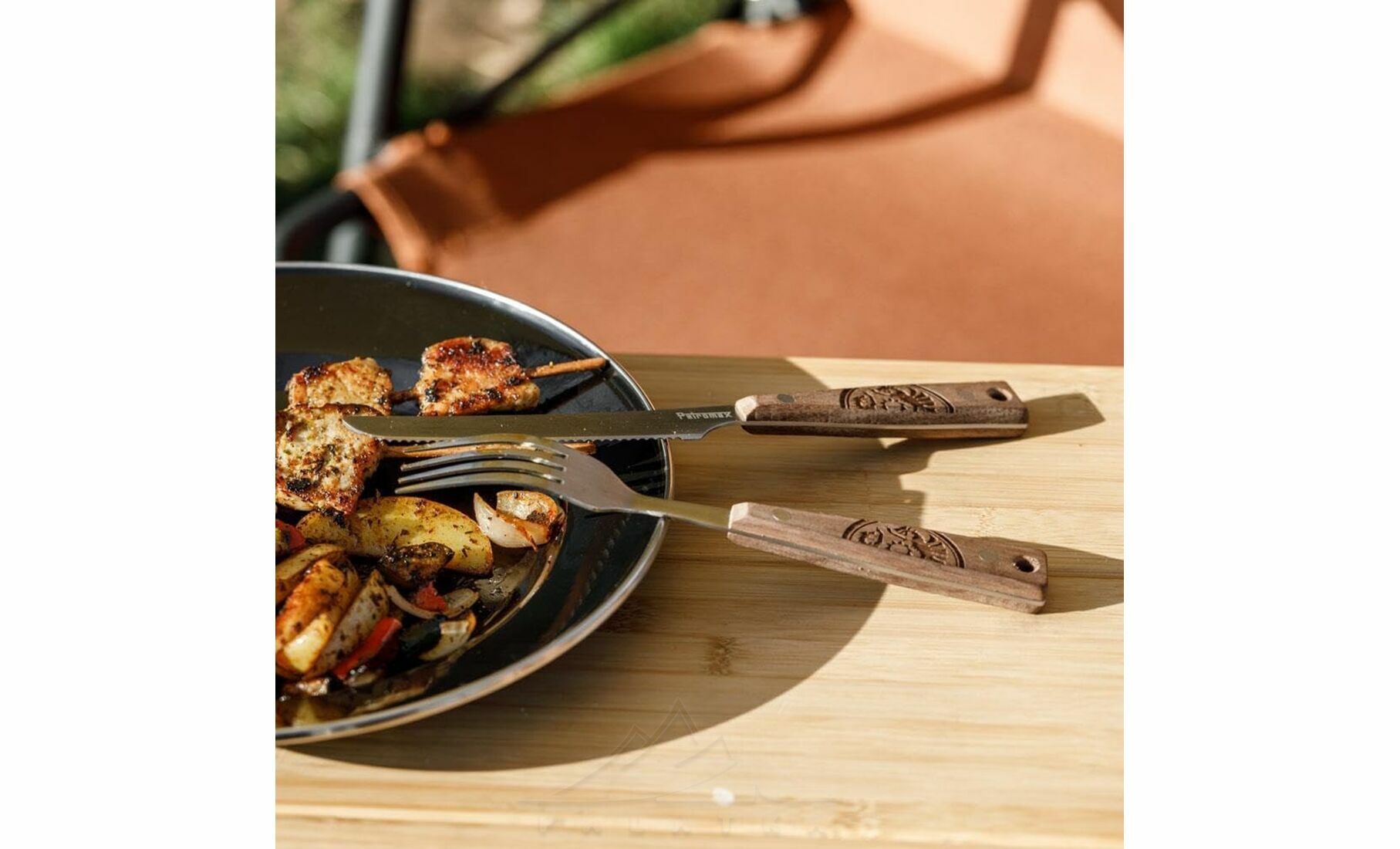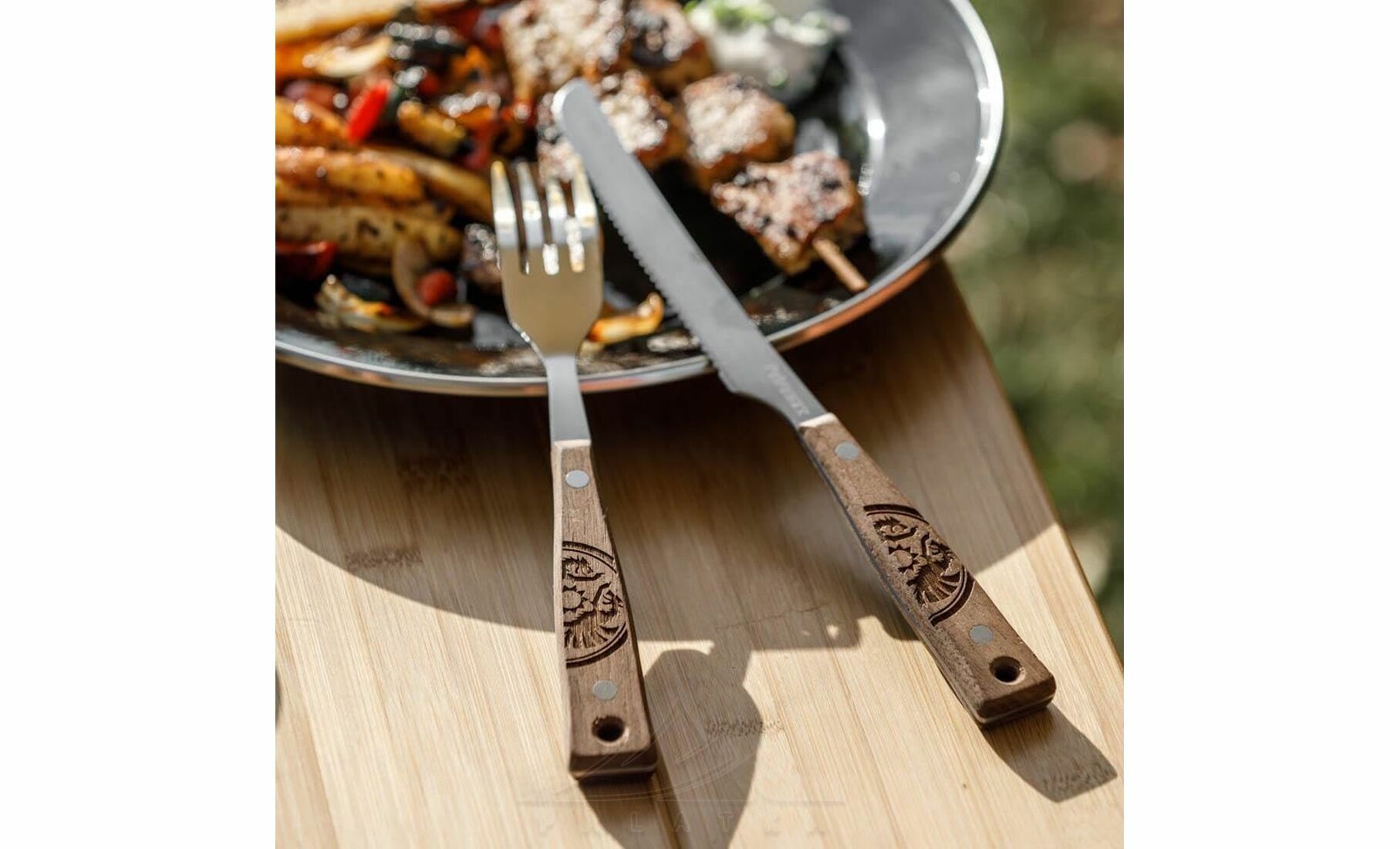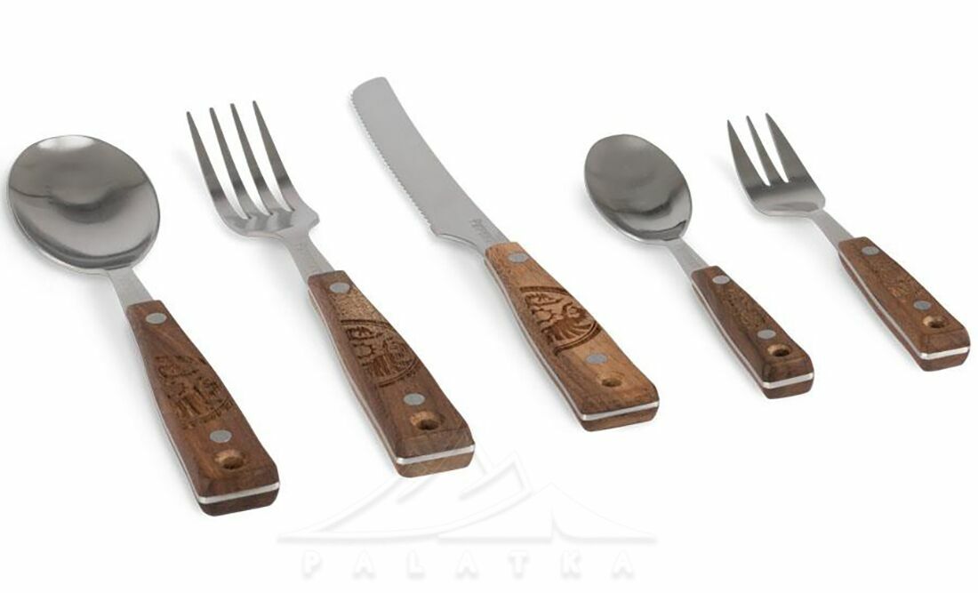 Petromax Camping Cutlery — практичний базовий набір столових приборів, виготовлений з матової нержавіючої сталі та горіхового дерева. Розрахований на дві особи.