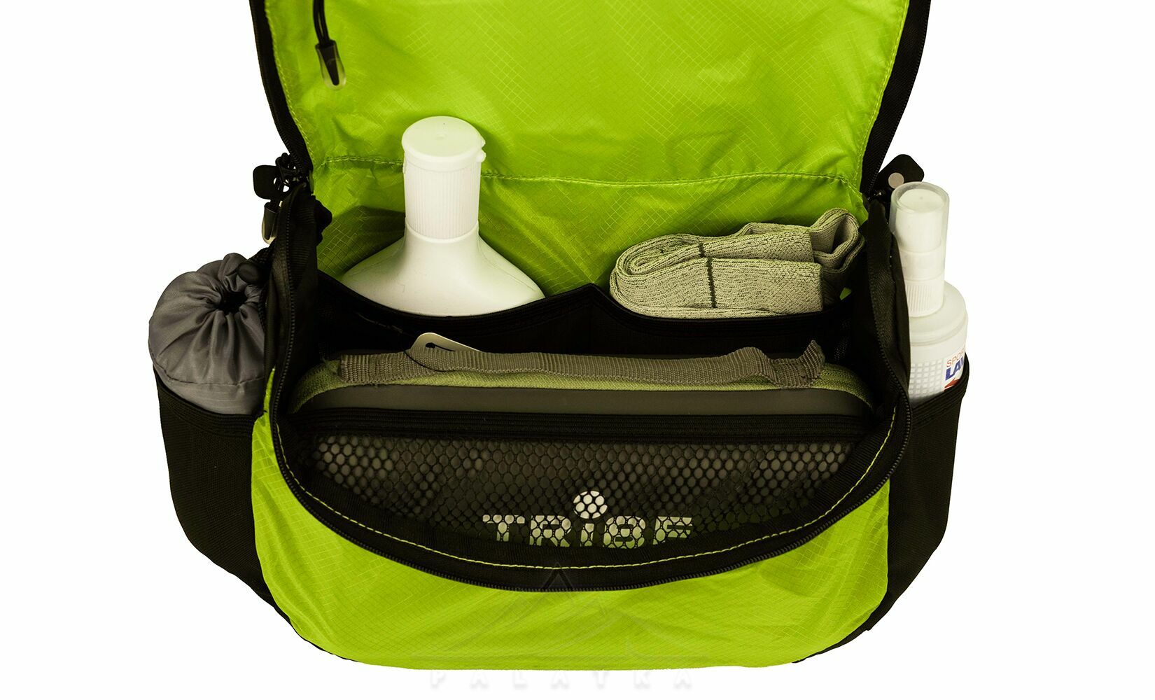 - Продумане внутрішнє наповнення з двома сітчастими кишенями та кишенею на блискавці допомагає розкласти дрібні речі окремо, щоб щітка, тюбики, флакони й аксесуари не змішувалися між собою