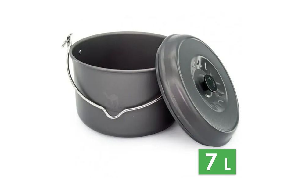 - Казанок має круглу ручку для підвішування над багаттям на триногу.