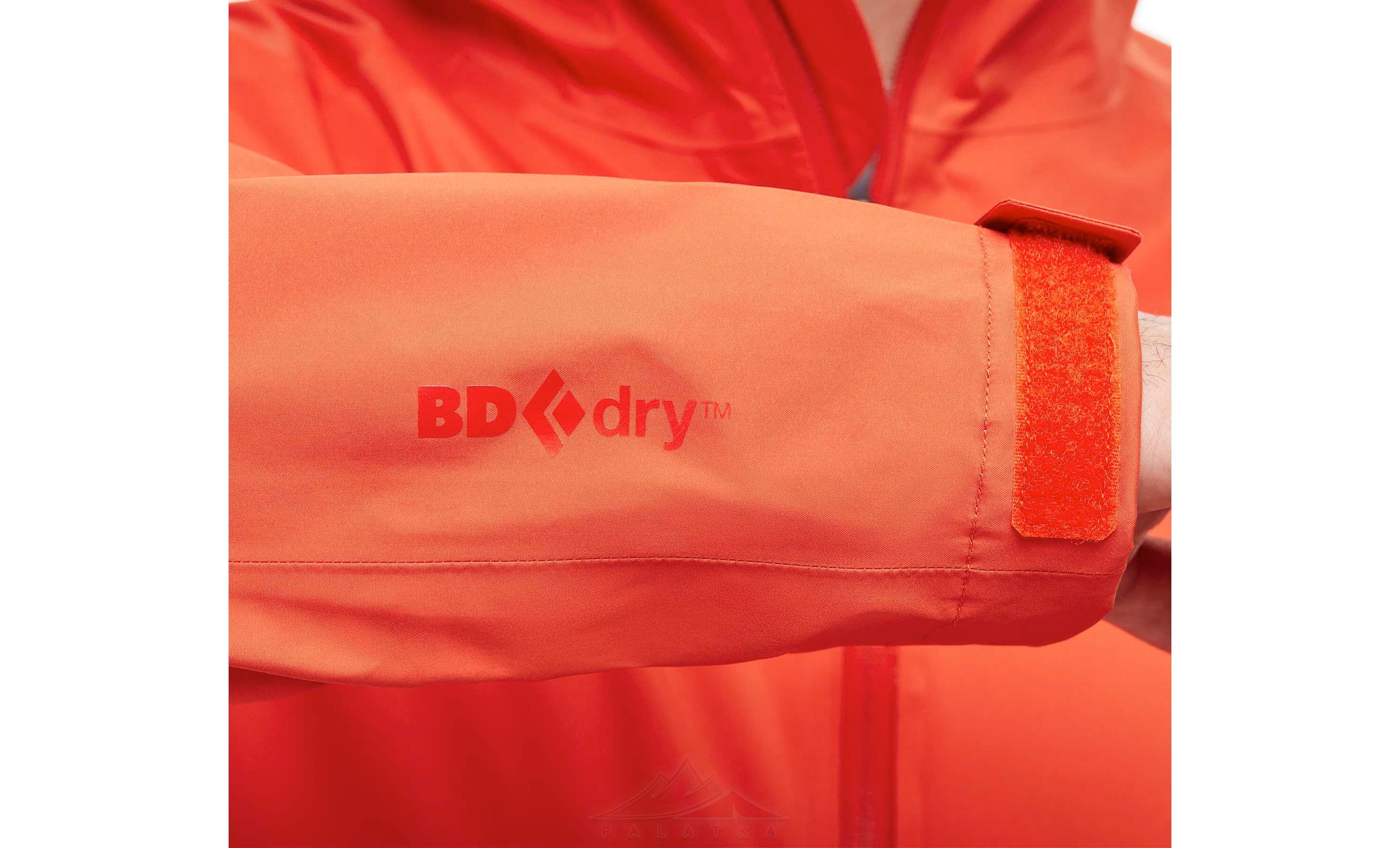 • Зовнішня тканина куртки — стійка і міцна нейлонова мембранна тканина BD.dry™ з водовідштовхувальним просоченням DWR— забезпечує високий вітро і водозахист, хорошу паропроникність і дихання матеріалу, виключаючи можливість утворення конденсату на внутрішній стороні куртки.