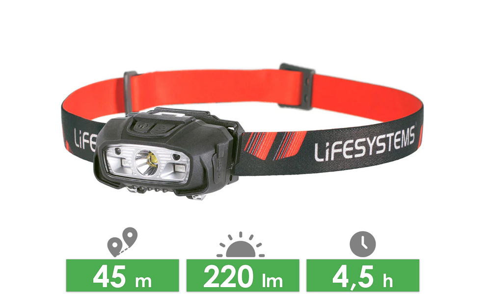 Налобний ліхтар Lifesystems Intensity 220 — легка акумуляторна модель для походів, кемпінгу, подорожей і повсякденних задач. Підійде тим, кому потрібен компактний ліхтар із білим світлом для роботи/руху та червоним світлом для табору, щоб не засліплювати себе й інших. Ліхтар заряджається через USB Type-C і має вбудований акумулятор, тому його зручно підзаряджати від павербанка в дорозі.