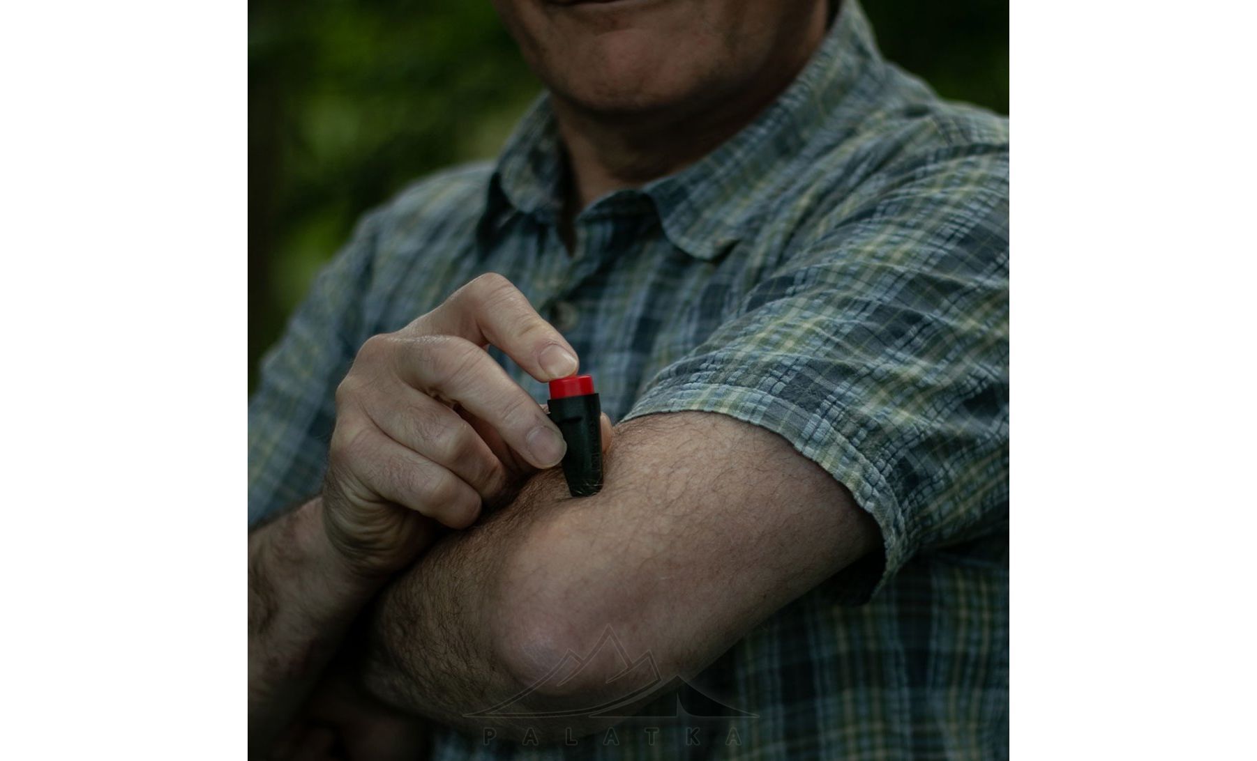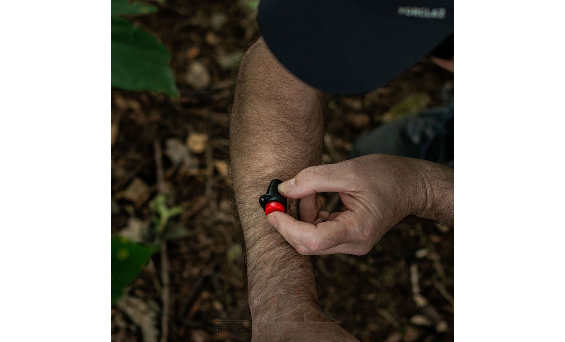 - Натискання пристрою 5-10 разів навколо місця укусу локалізує отруту та пригнічує вивільнення гістаміну, який викликає свербіж.