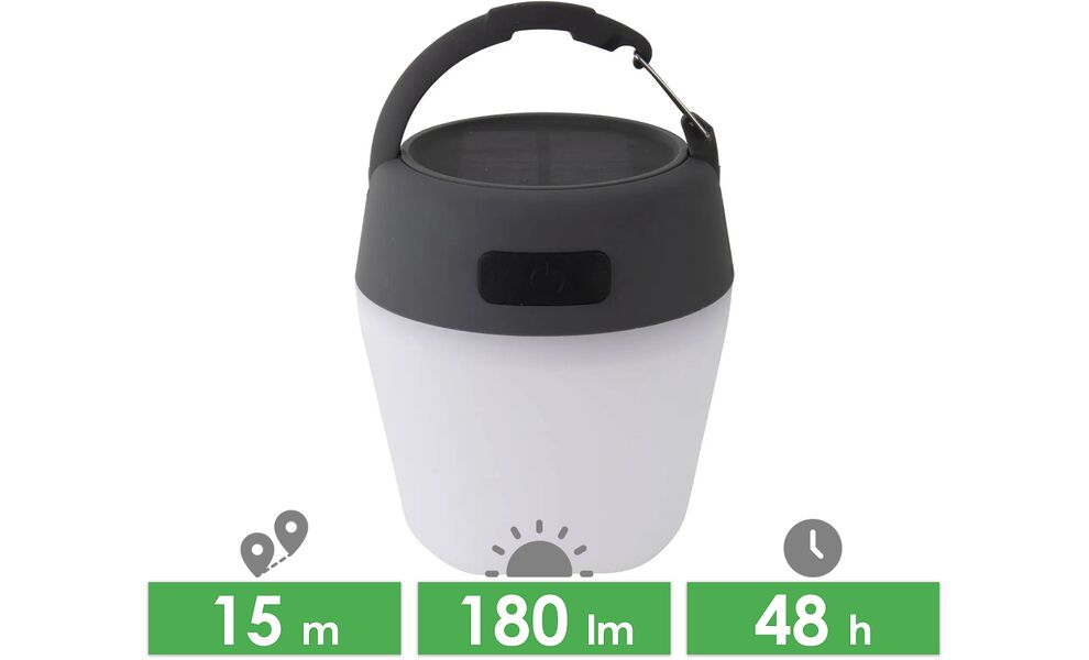 Світильник Bo-Camp Wega — це підвісний світильник з можливістю заряджання від сонця (сонячна панель) та кабеля Micro USB. Має приємне тепле біле світло та 4 режими освітлення: 30%, 60%, 100% та червоне світло. Вбудований літій-іонний акумулятор можна заряджати сонячною енергією або USB-кабелем, що входить в комплект. Має ручку-карабін, щоб зручно та надійно підвісити світильник. Також служить як павербанк для зарядки інших пристроїв. Максимальна яскравість 180 люмен.