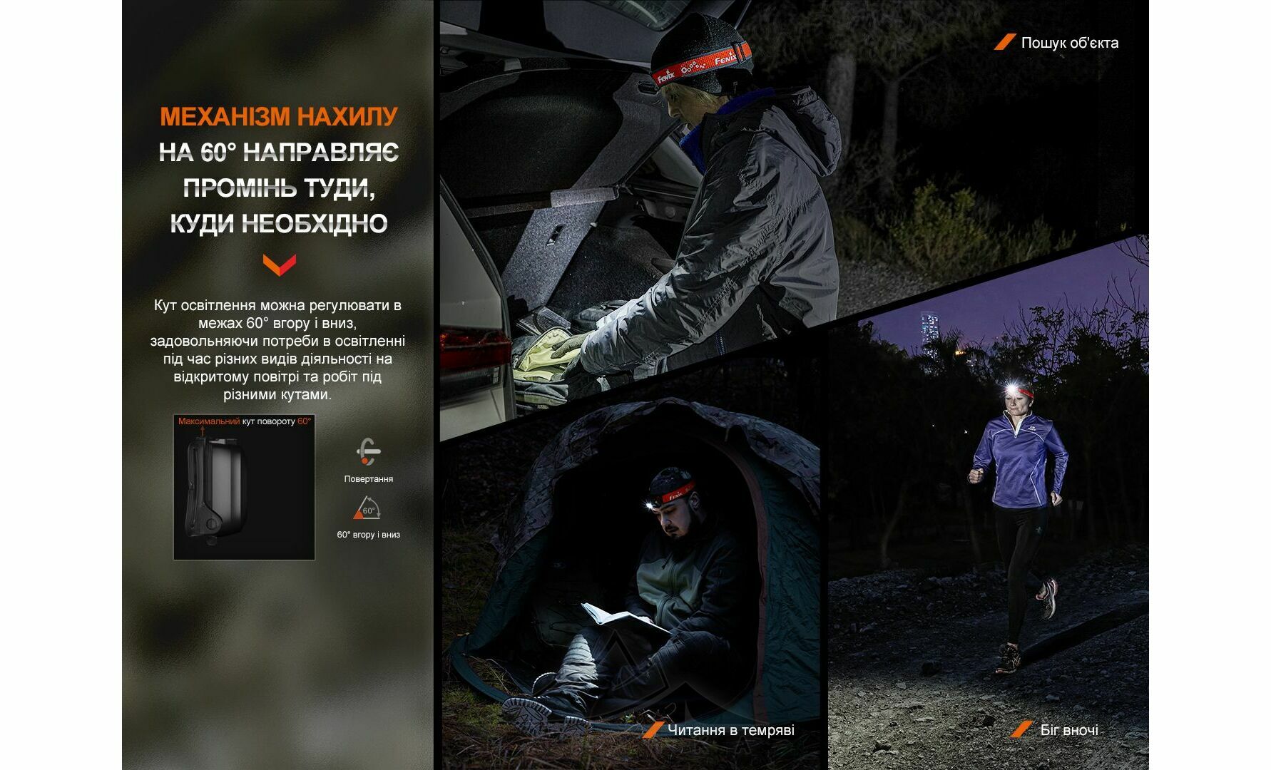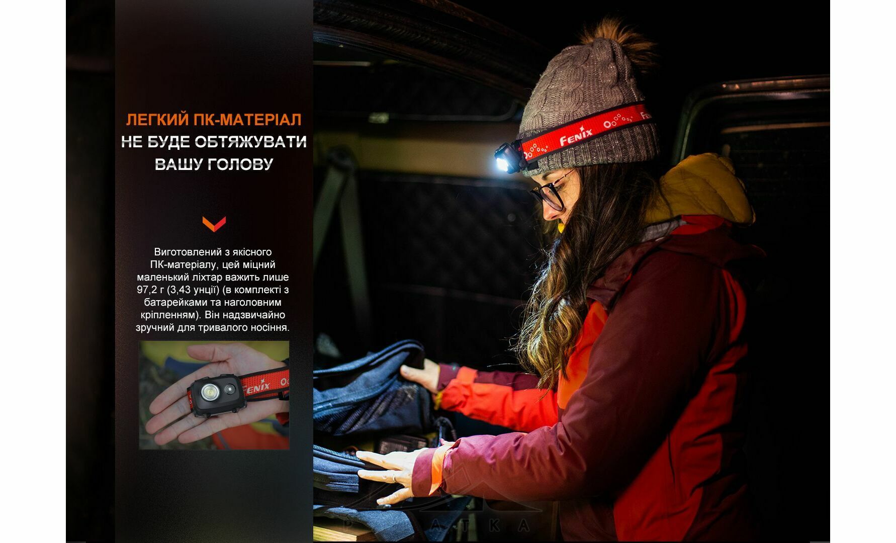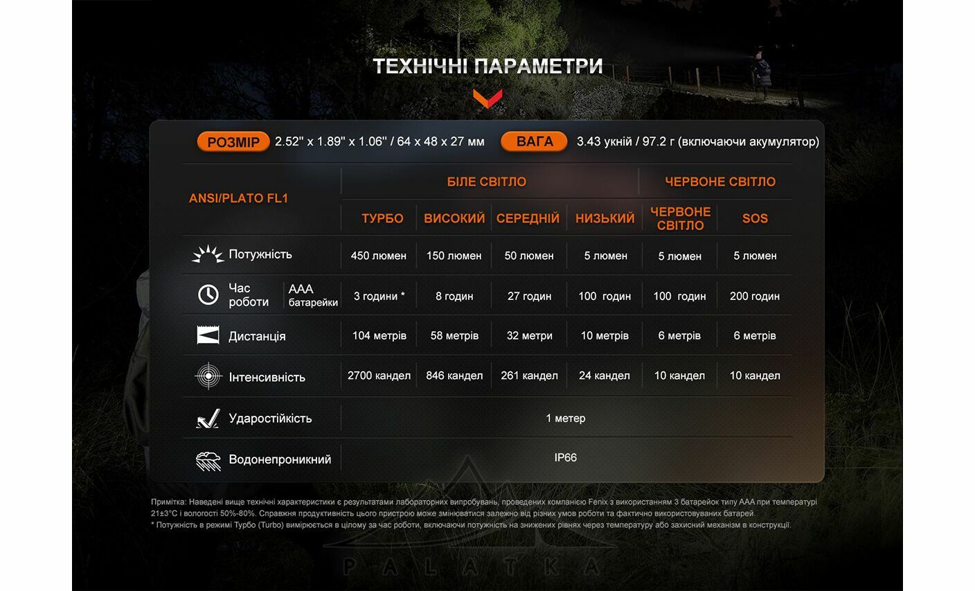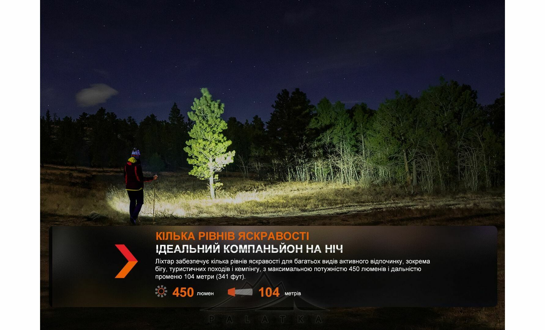 - Дальність світла до 104 м — зручно для пересування стежкою, у дворі або в таборі.