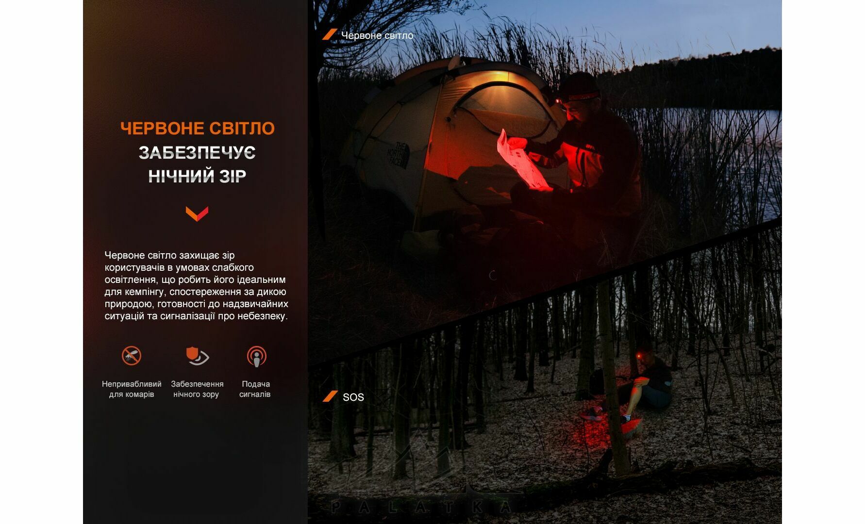 - Червоне світло — зручне для табору та роботи в темряві без сильного засліплення.