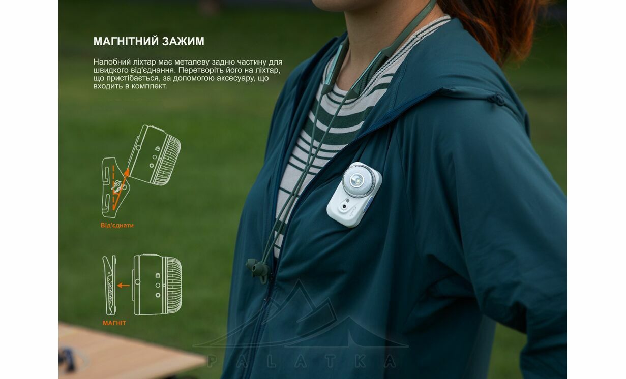 - Універсальні аксесуари в комплекті: задня швидкознімна кліпса, кріплення для використання як налобного або ручного ліхтаря, можливість встановлення на груди або металеві поверхні.