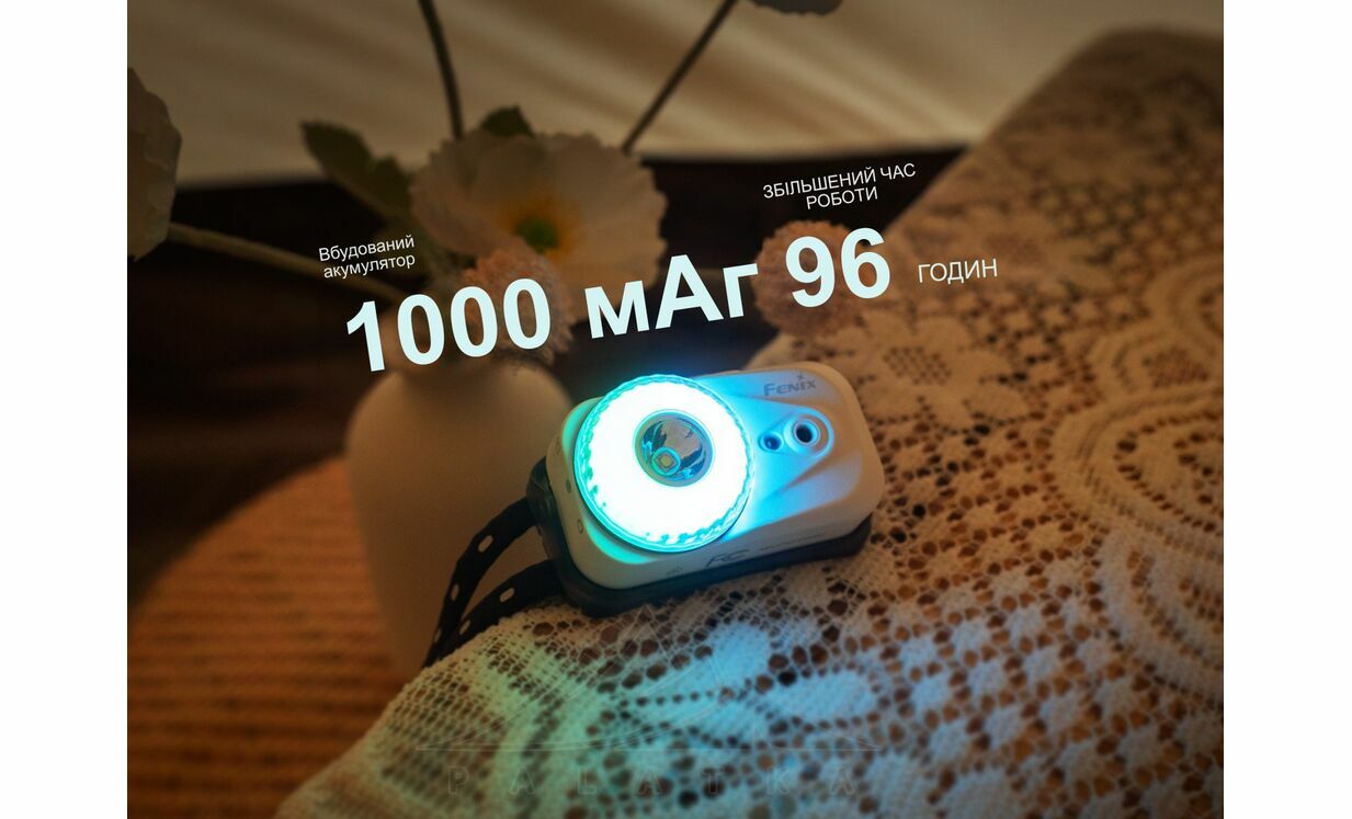 - Живлення від вбудованого акумулятора 1000 мА·год, який забезпечує до 96 год 50 хв роботи в економному режимі. Напруга 3.0–4.2 В гарантує стабільну роботу на всіх рівнях яскравості.