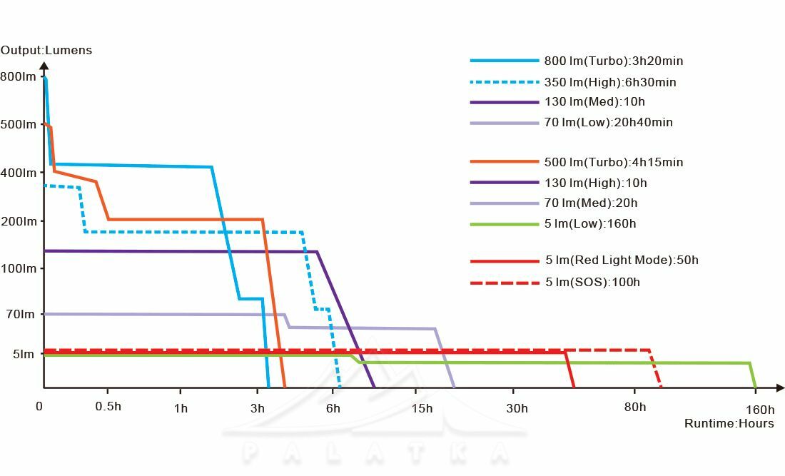 - Низький: 5 лм; час роботи — 160 год; дальність 9 м