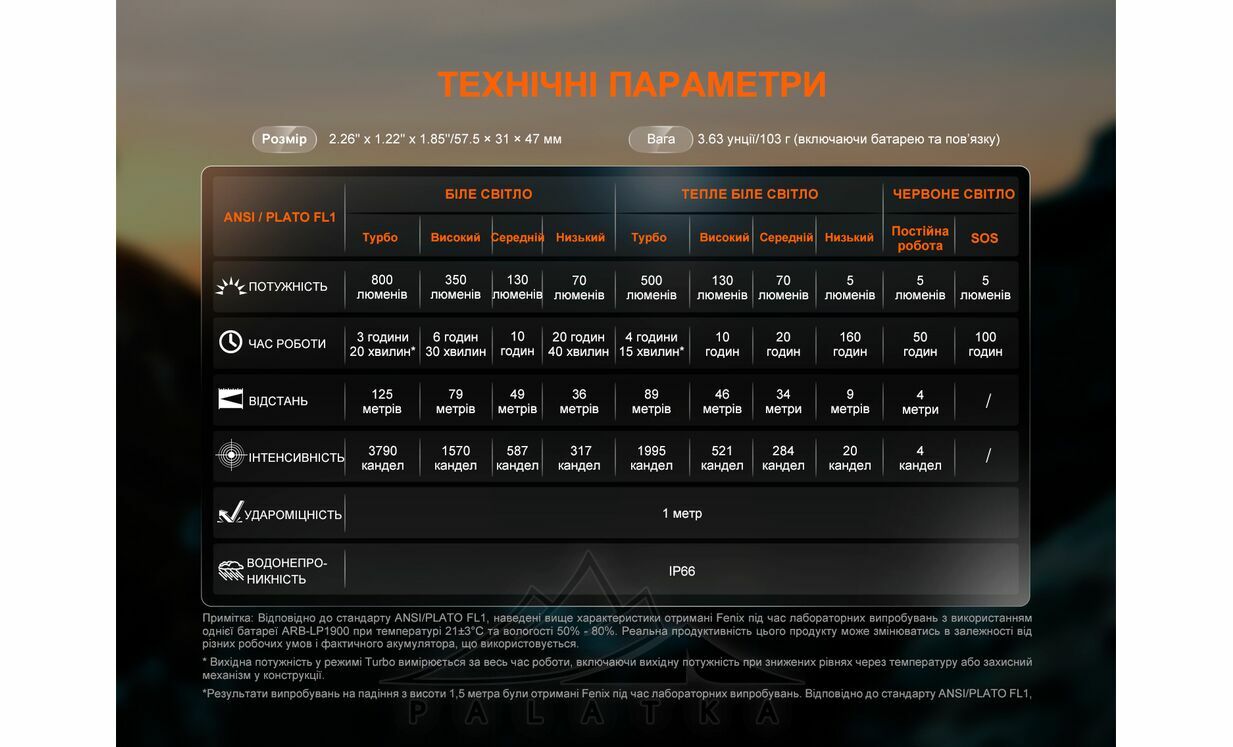 - Турбо: 800 лм; час роботи — 3 год 20 хв; дальність 125 м