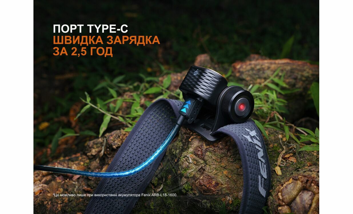 - Гібридне живлення: працює як від змінного акумулятора Fenix ARB-L18-1600 (18350) ємністю 1600 mAh (в комплекті), так і від двох батарейок CR123A (не входять у комплект).