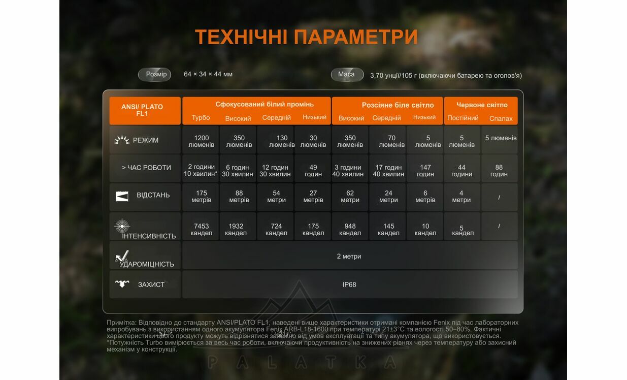 - Турбо: 1200 lm; час роботи - 2 год 10 хв; дальність - 175 м