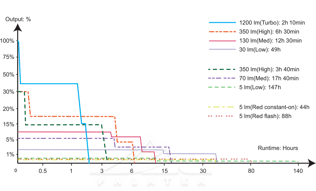 • Низький: 5 lm; час роботи - 141 год 10 хв; дальність - 6 м