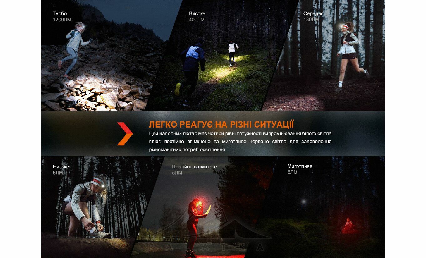 - Максимальна яскравість 1200 люмен — хороший запас світла для бігу, трекінгу та побутових задач у темний час.