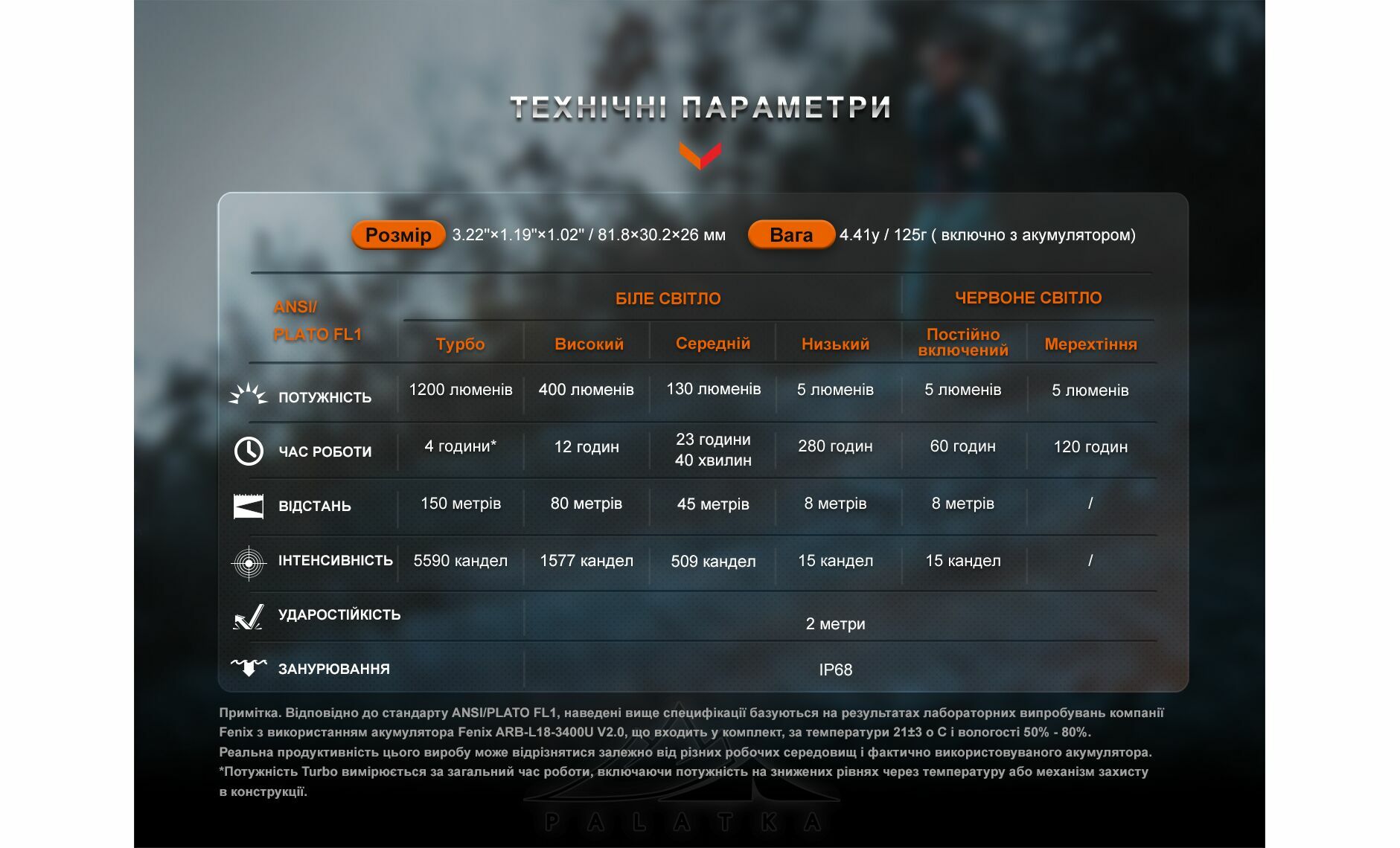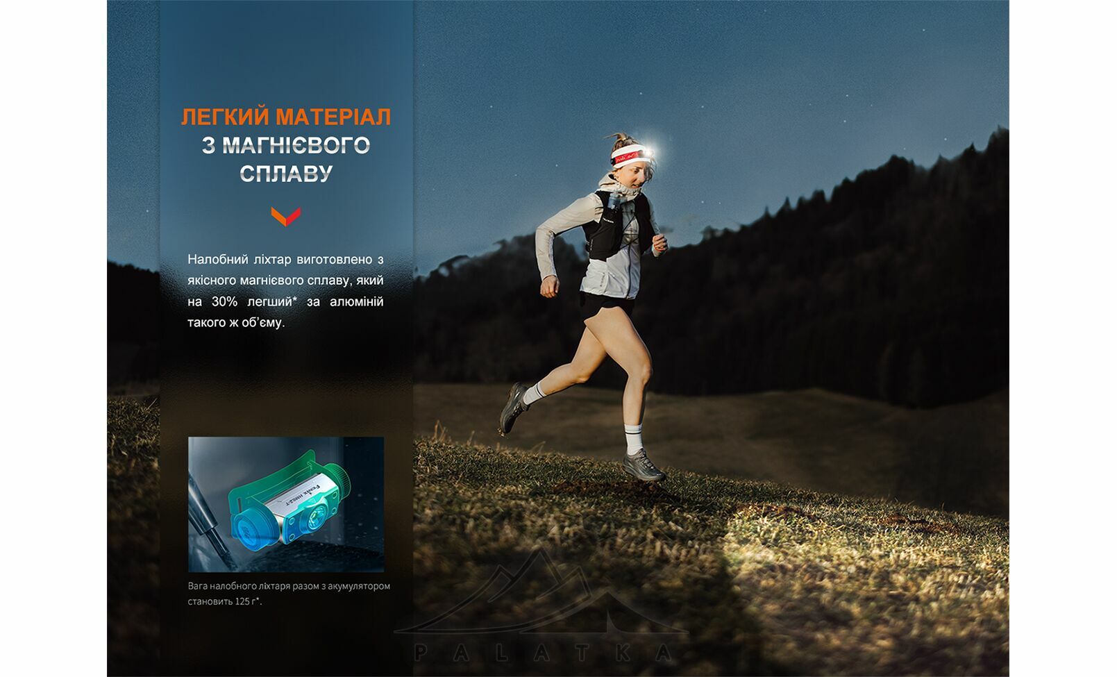 - Вага 125 г і розміри 8,18x3,02x2,6 см — компактний формат без переходу в “важкий” клас налобників.