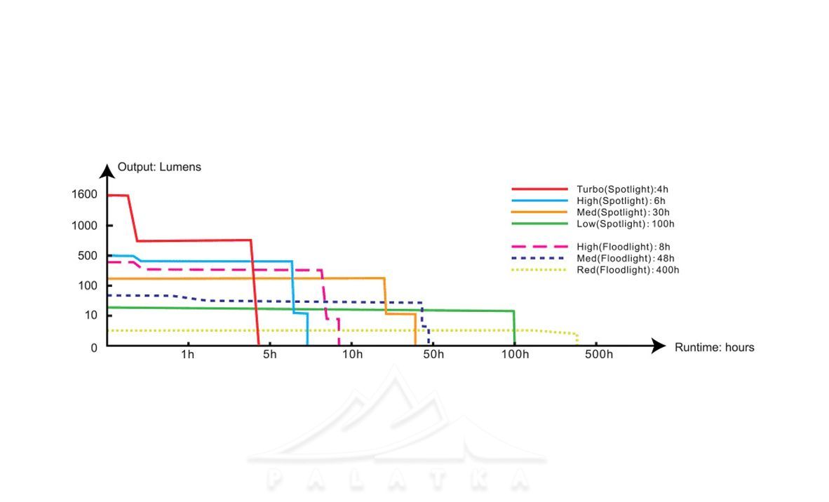 - TURBO: яскравість — 1600 люмен, час роботи — 2 години, дальність — 186 м.