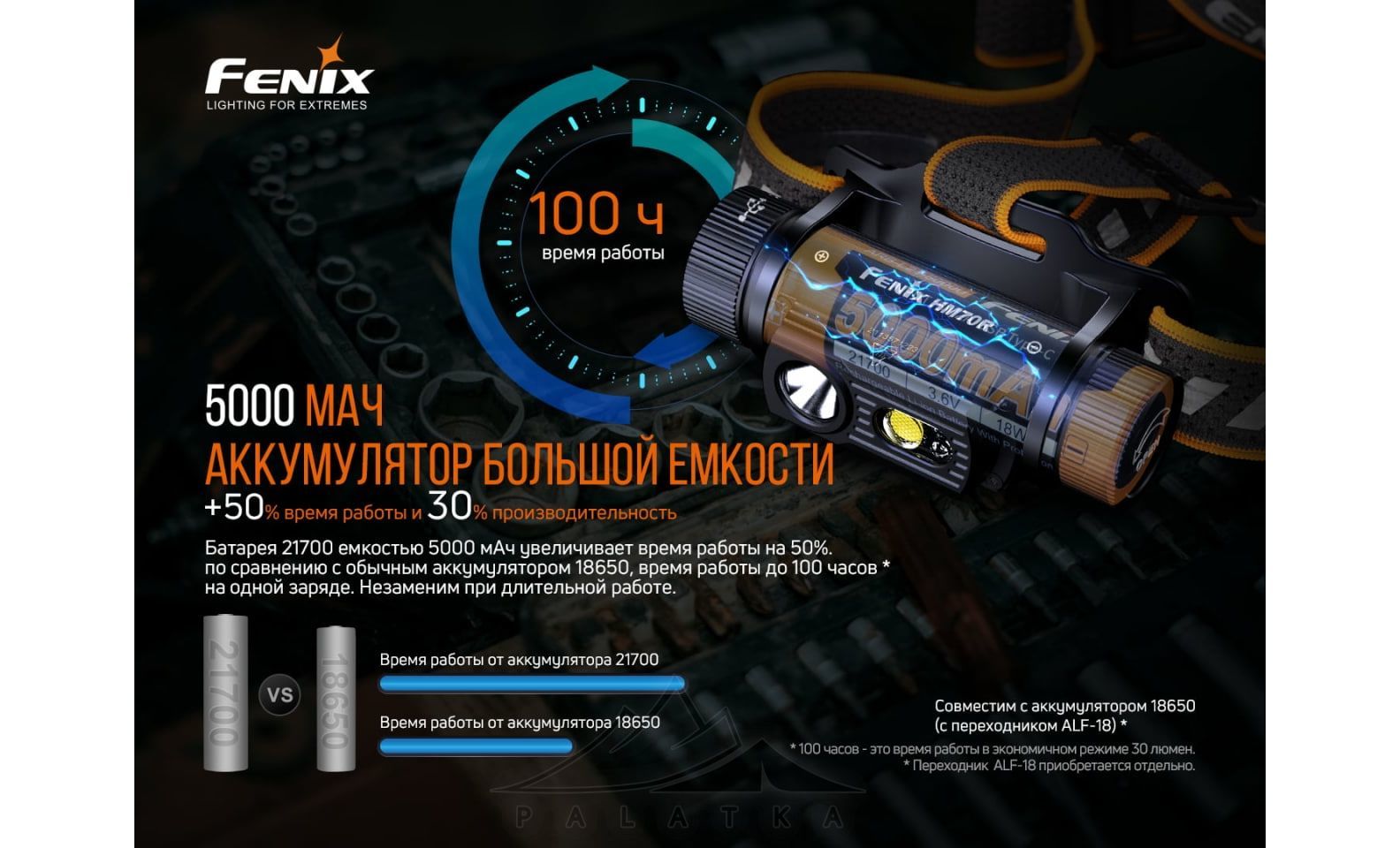 - Має потужний акумулятор формату (21700), який дозволить вам забезпечити себе світлом до 100 годин. Можливість перезарядки робить його екологічним.
