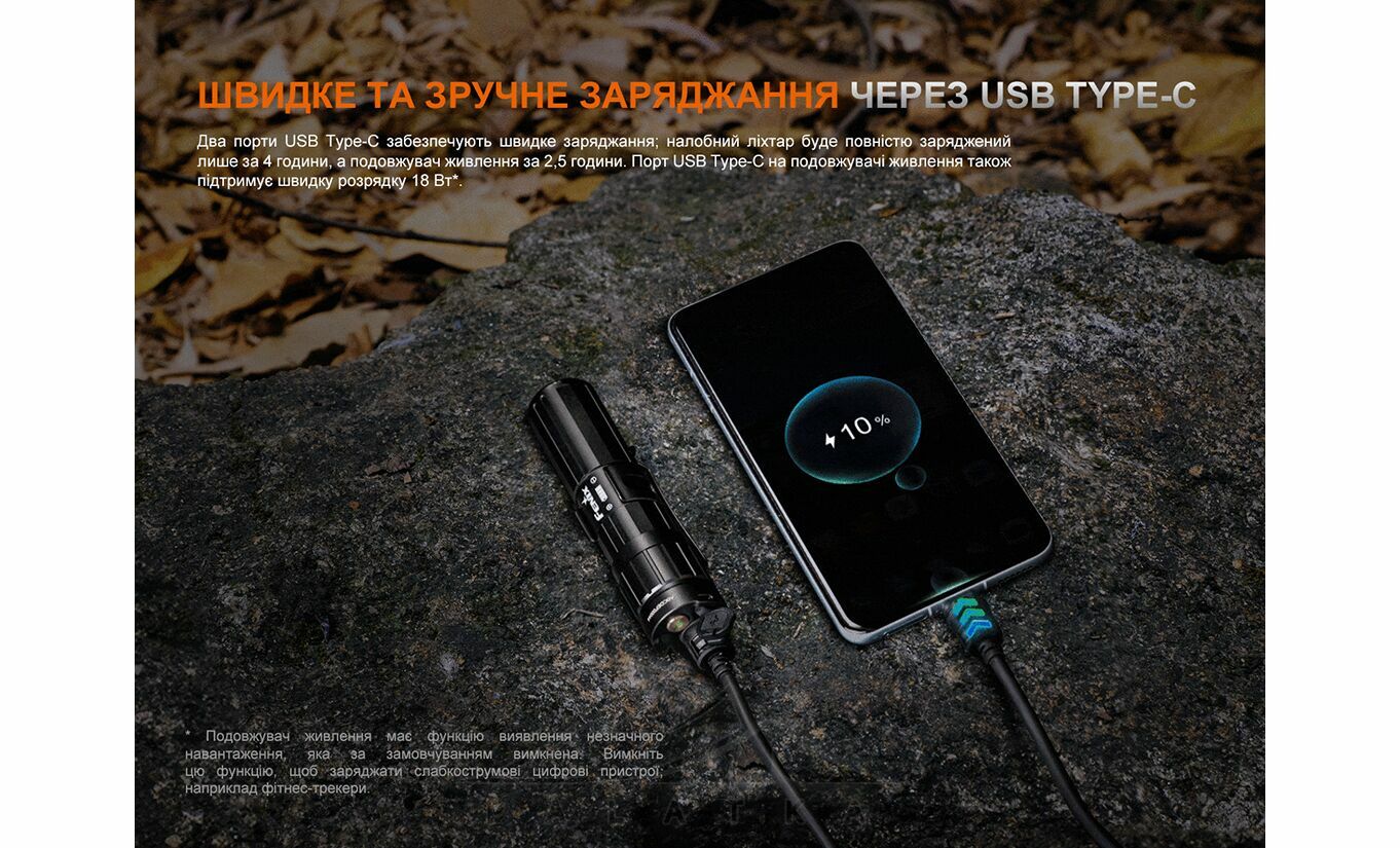 - Порт USB Type-C у ліхтарі — зручно заряджати від павербанка, адаптера або USB-порту.
