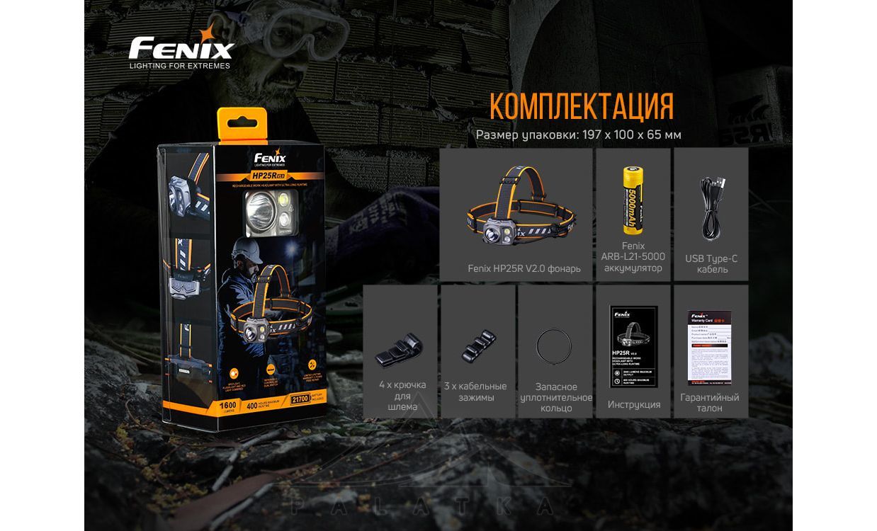 - У комплекті акумулятор Fenix ARB-L21-5000 (5000 mAh), кабель USB Type-C, 4 гачки для шолома, 3 кліпси для кабелю та ущільнювальне кільце — можна користуватися відразу після покупки.