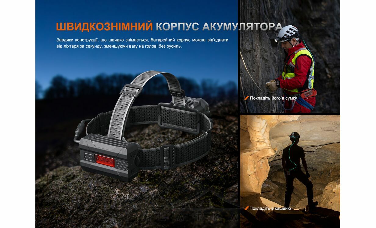 - Зручне керування: поворотний перемикач обирає групу режимів, а електронний — регулює яскравість. Усі налаштування доступні без зняття ліхтаря з голови.