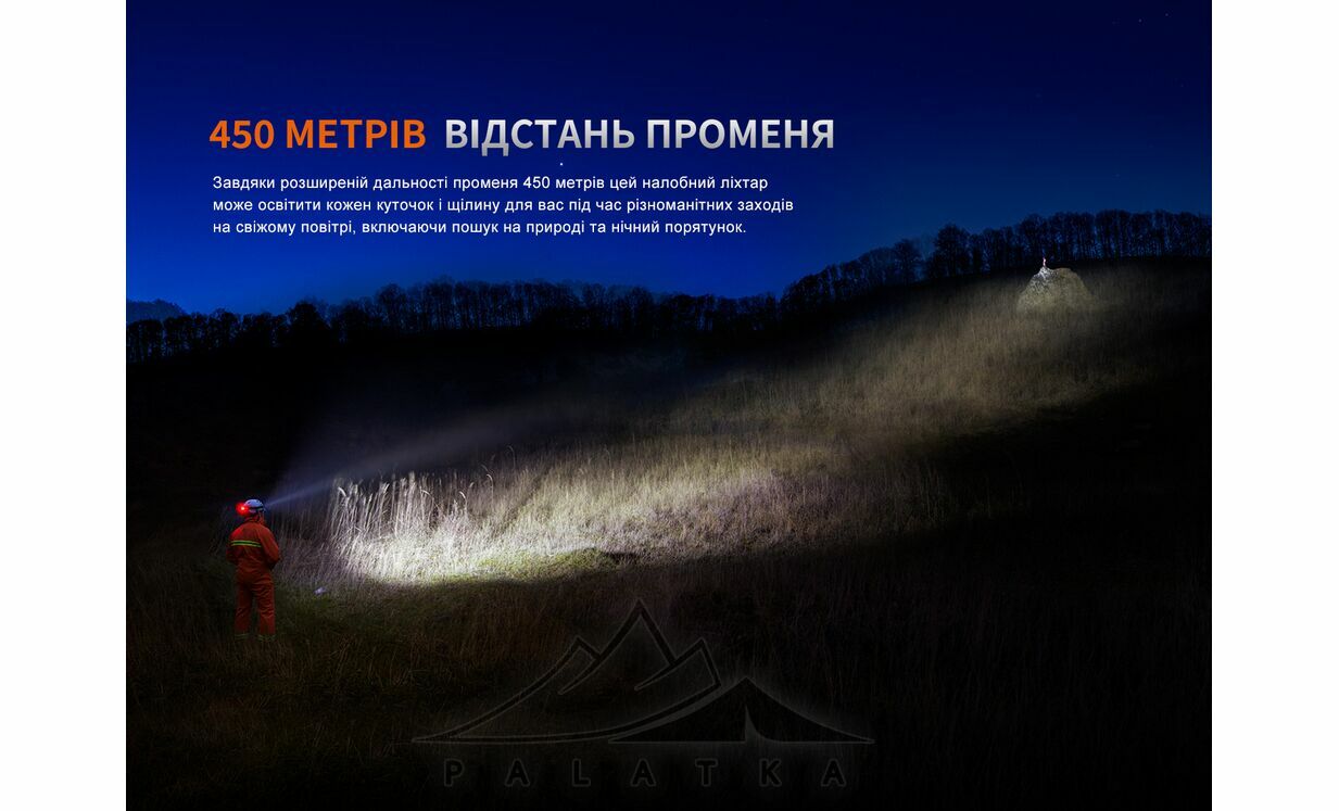 - Максимальна яскравість — 4000 lm у комбінованому режимі з дальністю променя до 450 м.