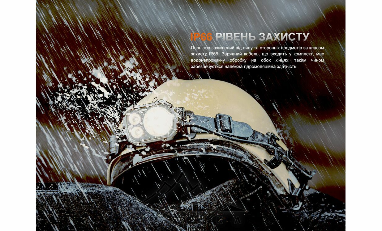 - Три світлодіоди: один нейтральний білий XHP70 та два теплі Luminus SST20, що забезпечують природну передачу кольорів та впевнене освітлення в тумані й негоді.