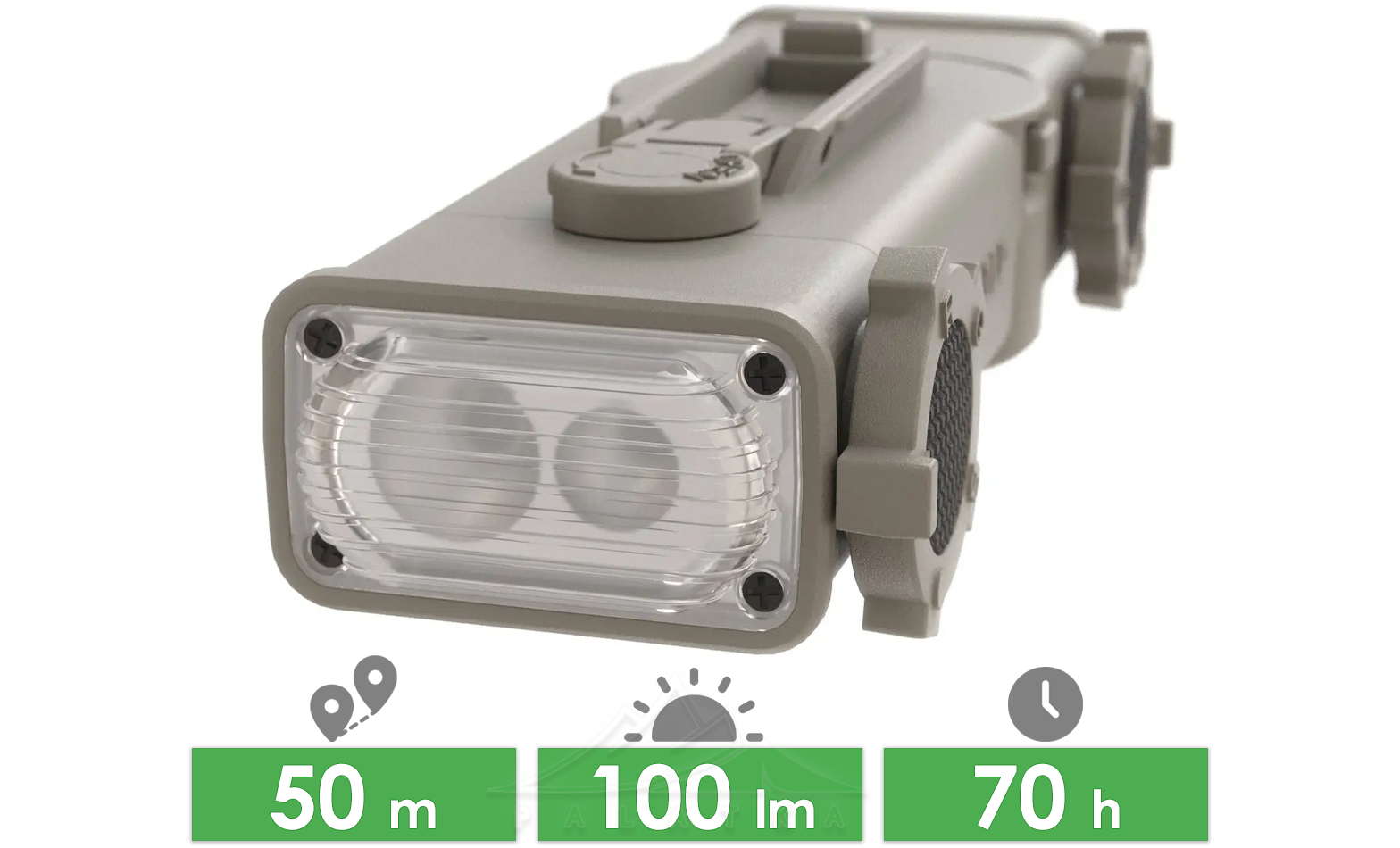 - Оснащений світлодіодами різних кольорів та інфрачервоним (IR) випромінювачем в передній та задній частині ліхтаря.