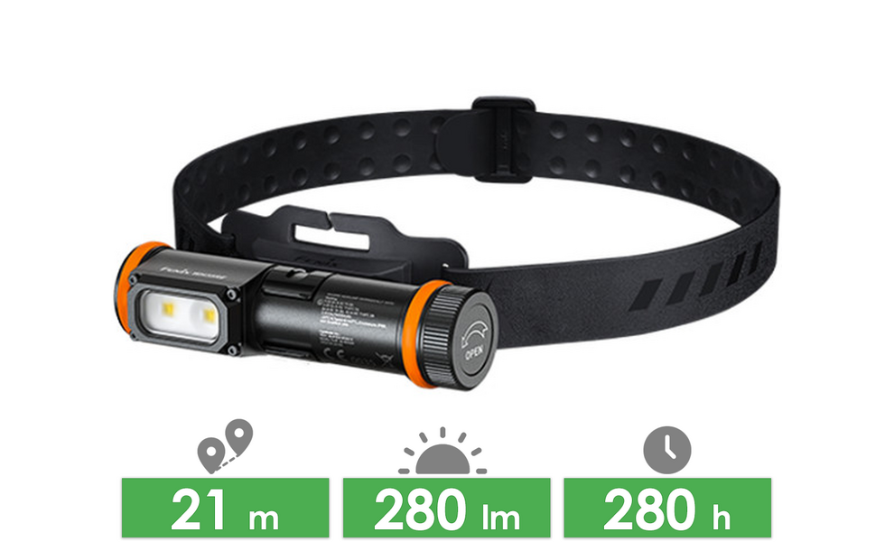 - Регульований еластичний ремінець забезпечує стабільну посадку на голові або касці. Додатково є знімний затискач для фіксації на кишені, стропі чи лямці рюкзака.