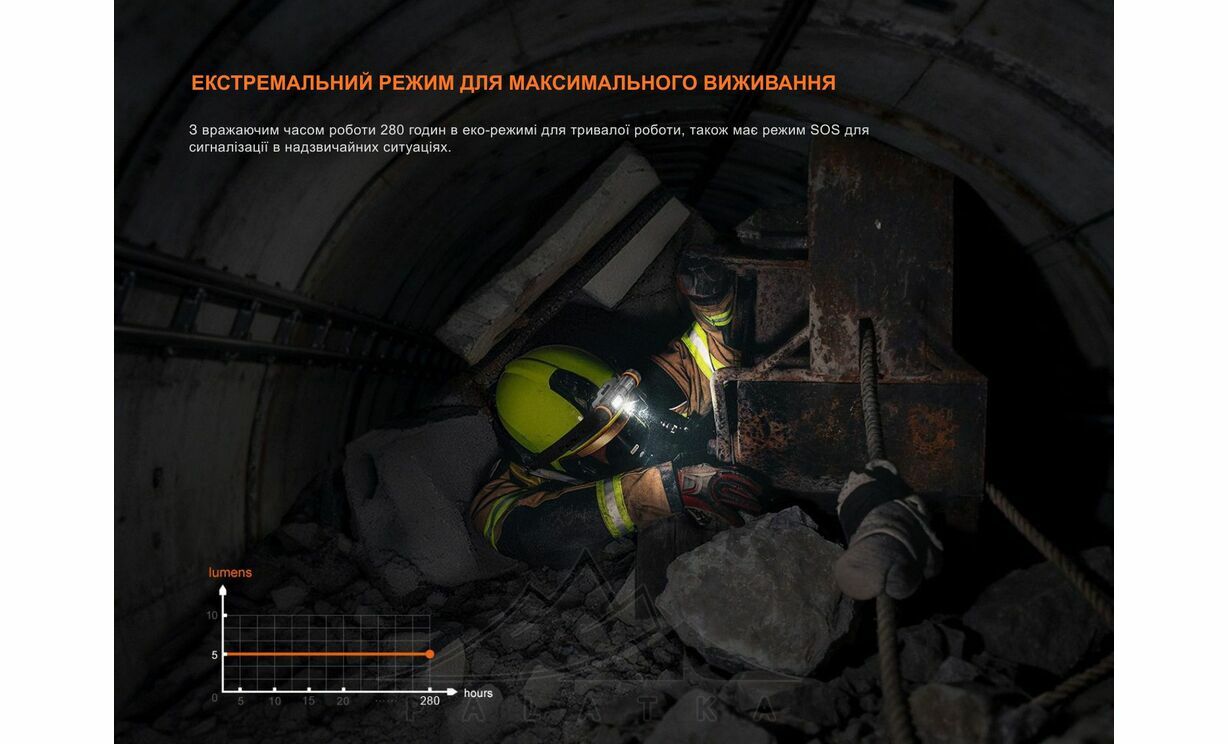- Економний: 5 lm; час роботи - 280 год; дальність - 3 м