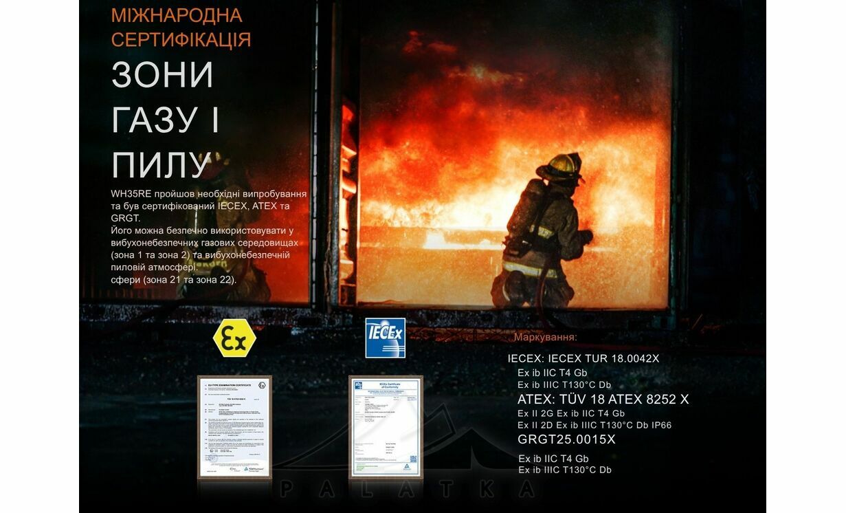 - Сертифікований за стандартами IECEx, ATEX та GRGT, що підтверджує його безпечність у вибухонебезпечних зонах.