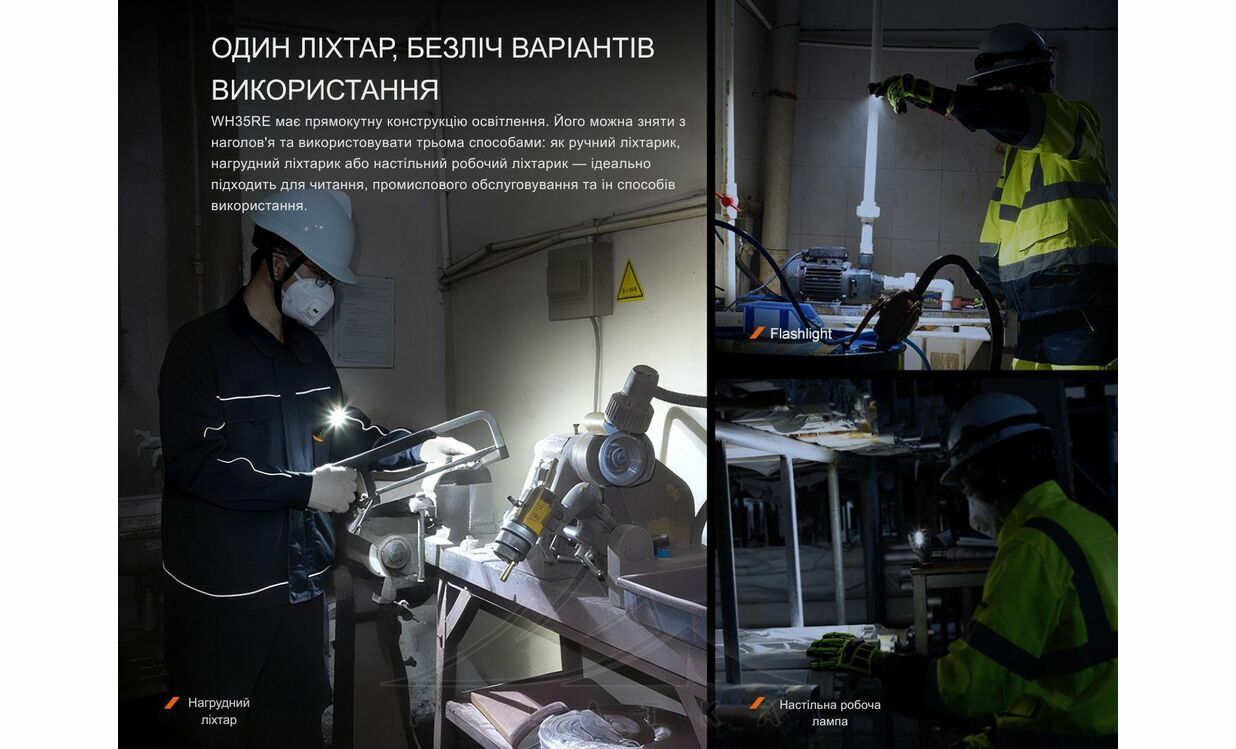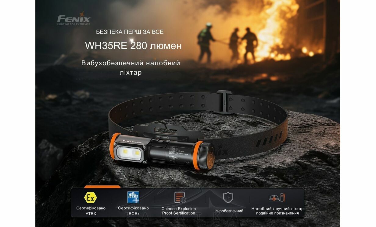 Fenix WH35RE — вибухозахищений налобний ліхтар, створений для роботи в середовищах із ризиком займання газових або пилоповітряних сумішей. Він підходить для застосування на об’єктах нафтохімії, енергетики, металургії, а також у целюлозно-паперовій та текстильній промисловості.
