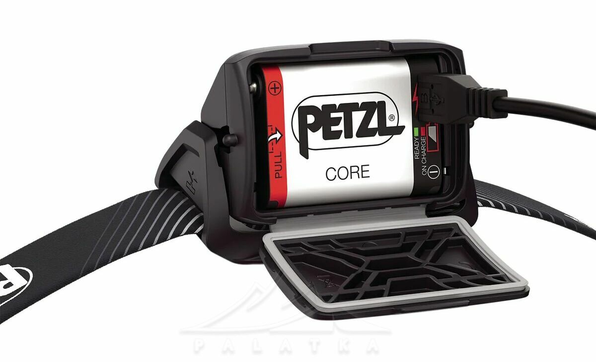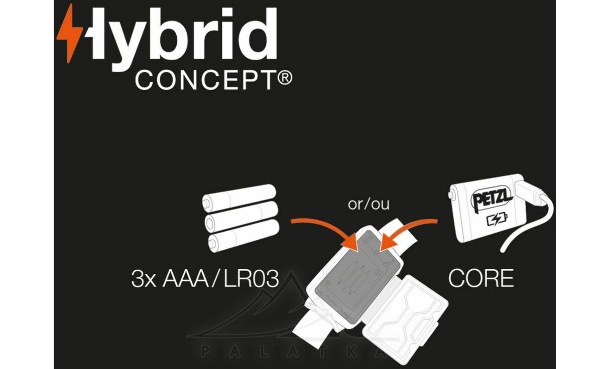 - Має гібридний тип живлення. Працює від перезаряджаємого акумулятора Petzl Core, що є безпечним для природи, або від трьох батарейок AAA/LR03.