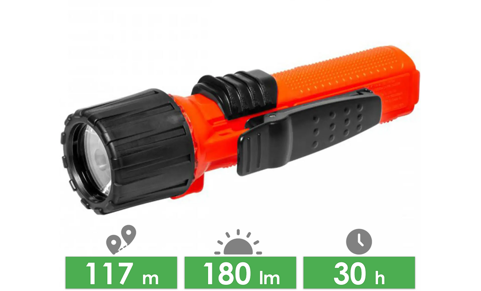 - Протиковзка ергономічна конструкція корпусу та текстурована ручка забезпечують надійне утримання ліхтаря.
