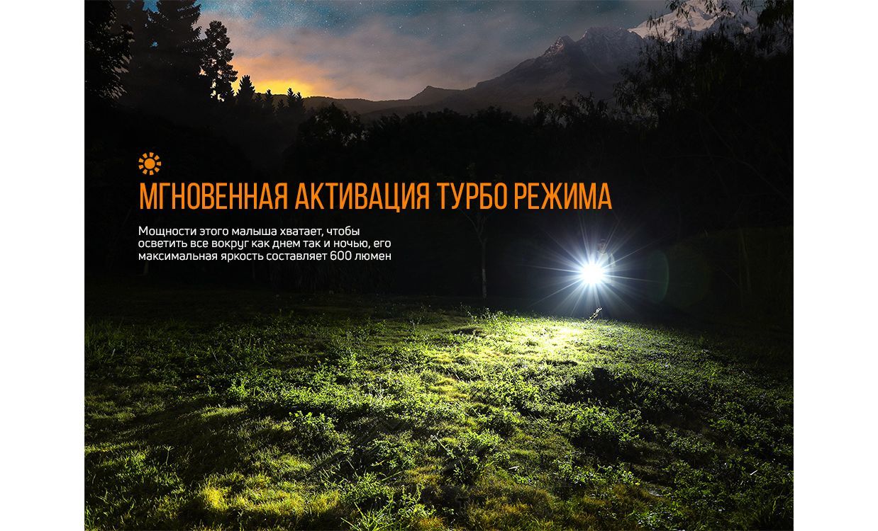 - TURBO: яскравість — 600 люмен, дальність — 124 м.