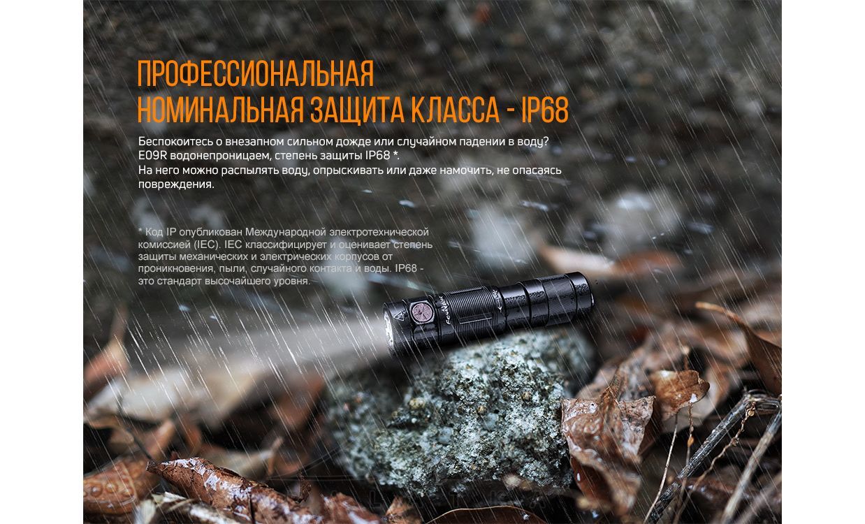 - Стандарт захисту від пилу та води: IP68 — повністю захищає від пилу, ліхтар можна занурювати в воду до 2 м.