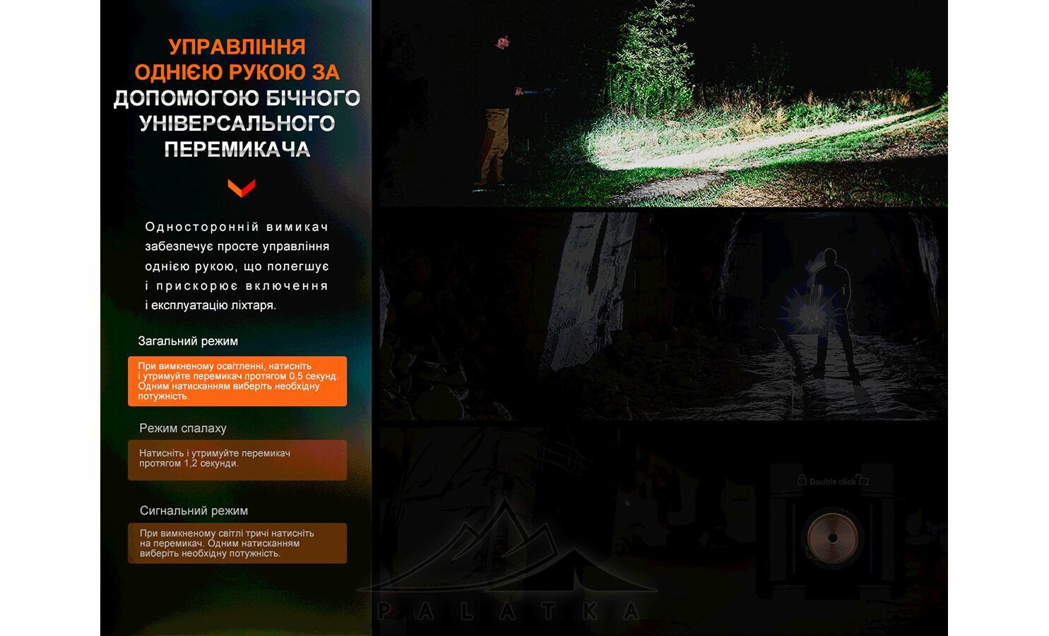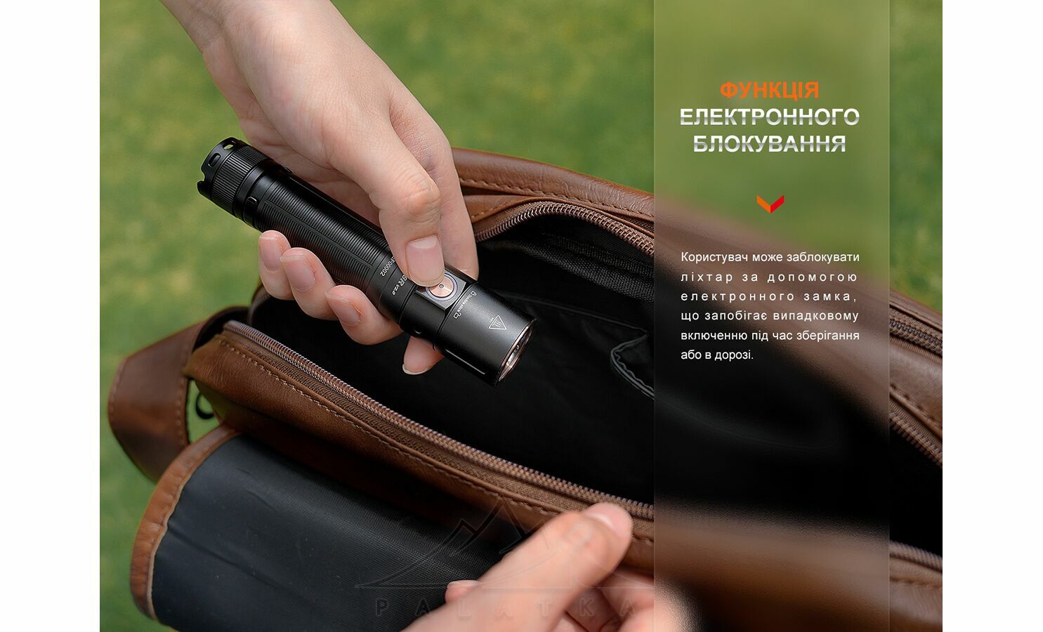 - Функція блокування — зменшує ризик випадкового увімкнення в кишені, сумці або спорядженні.