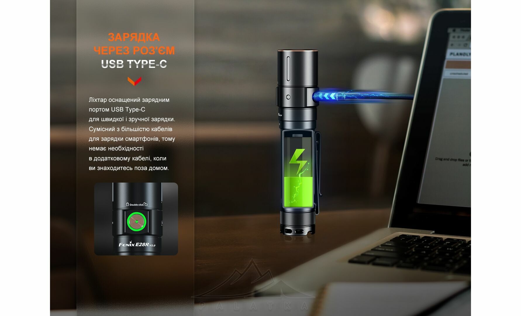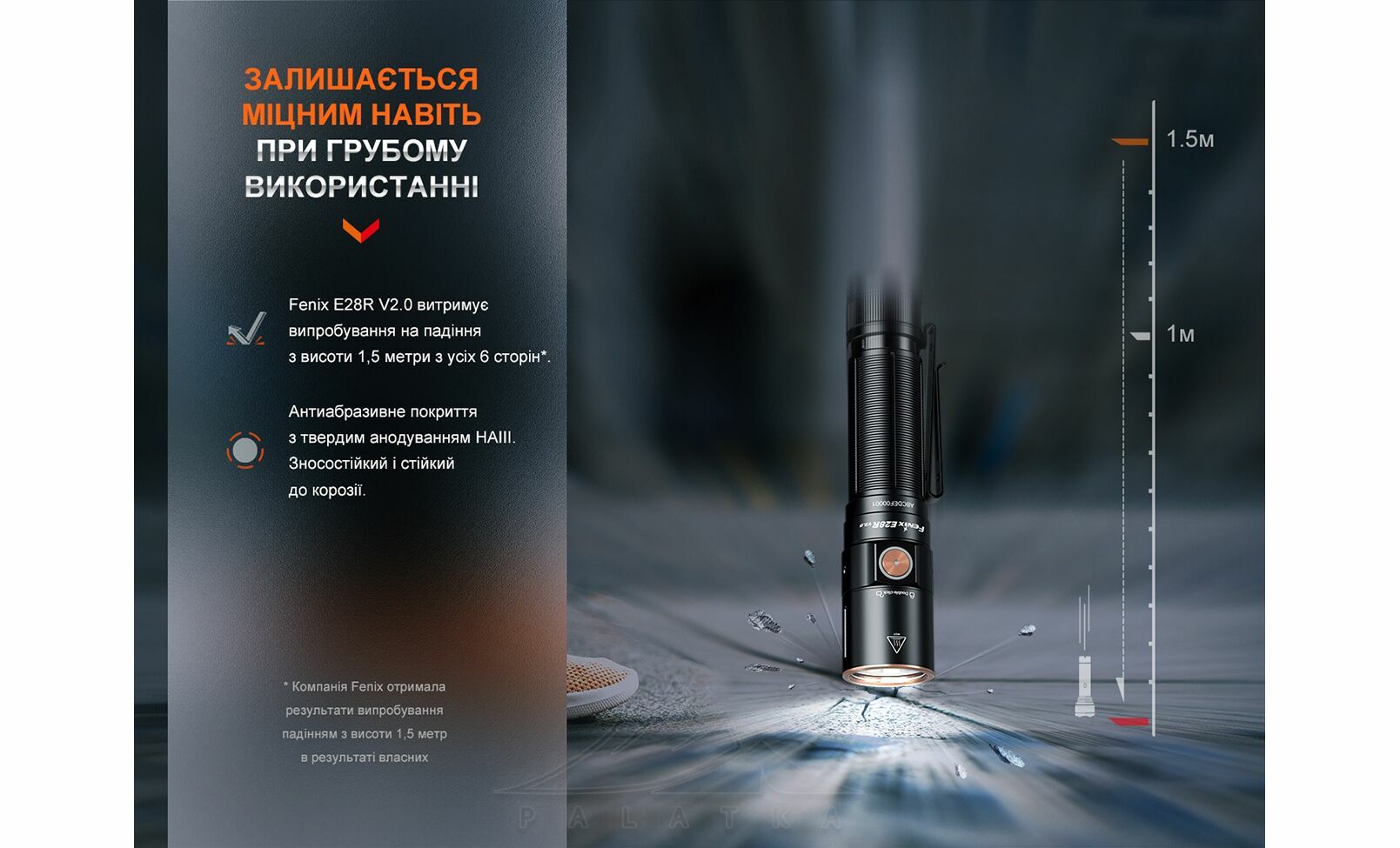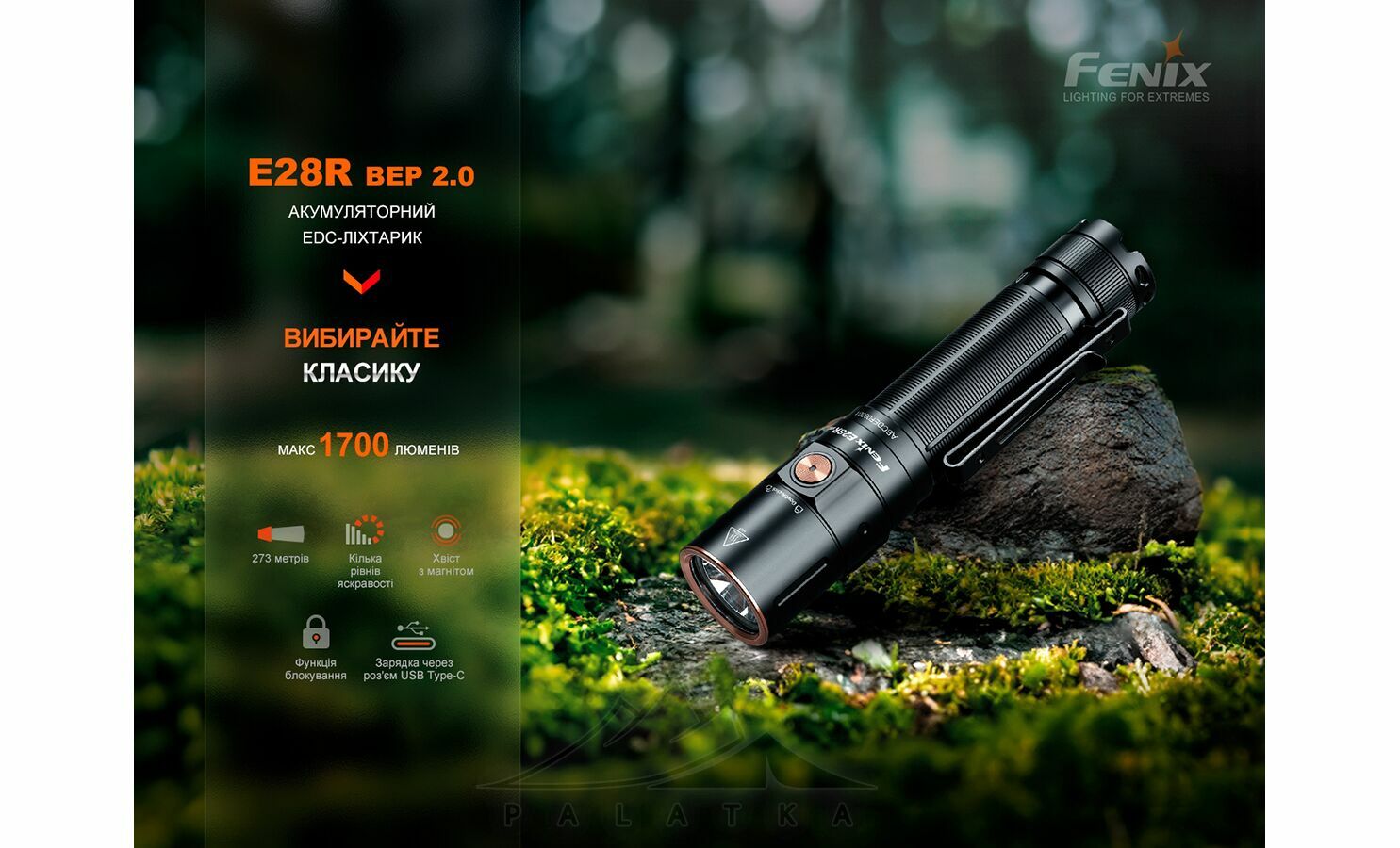Fenix E28R V2.0 — дуже вдалий варіант, якщо потрібен компактний EDC-ліхтар із запасом потужності та реально зручними функціями на щодень: магнітна основа, кліпса, USB-C заряджання, індикатор заряду і режим Pulse для швидкого пошуку ліхтаря в темряві.