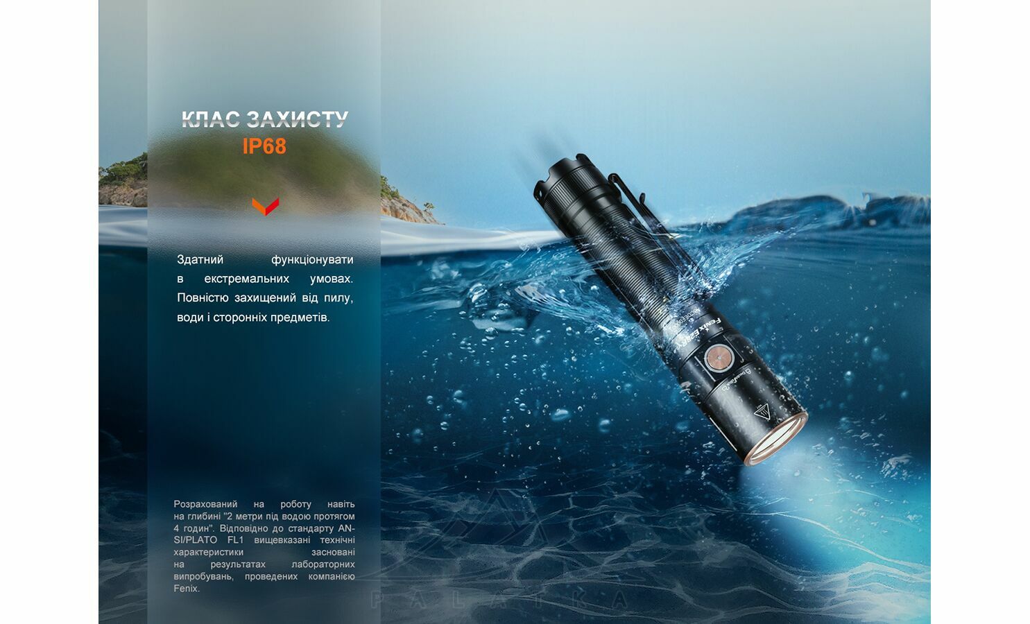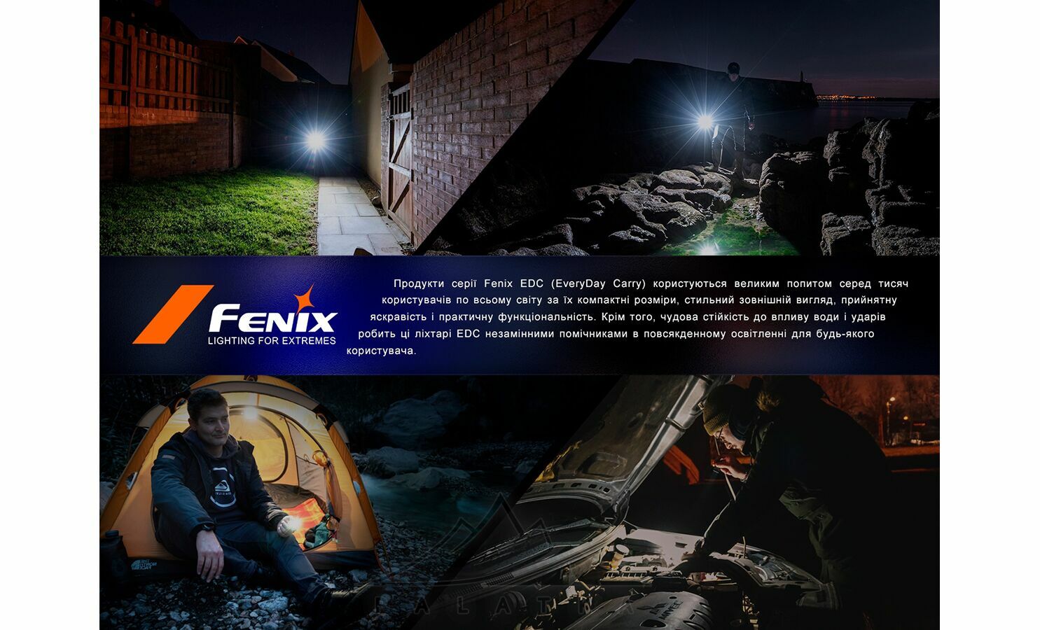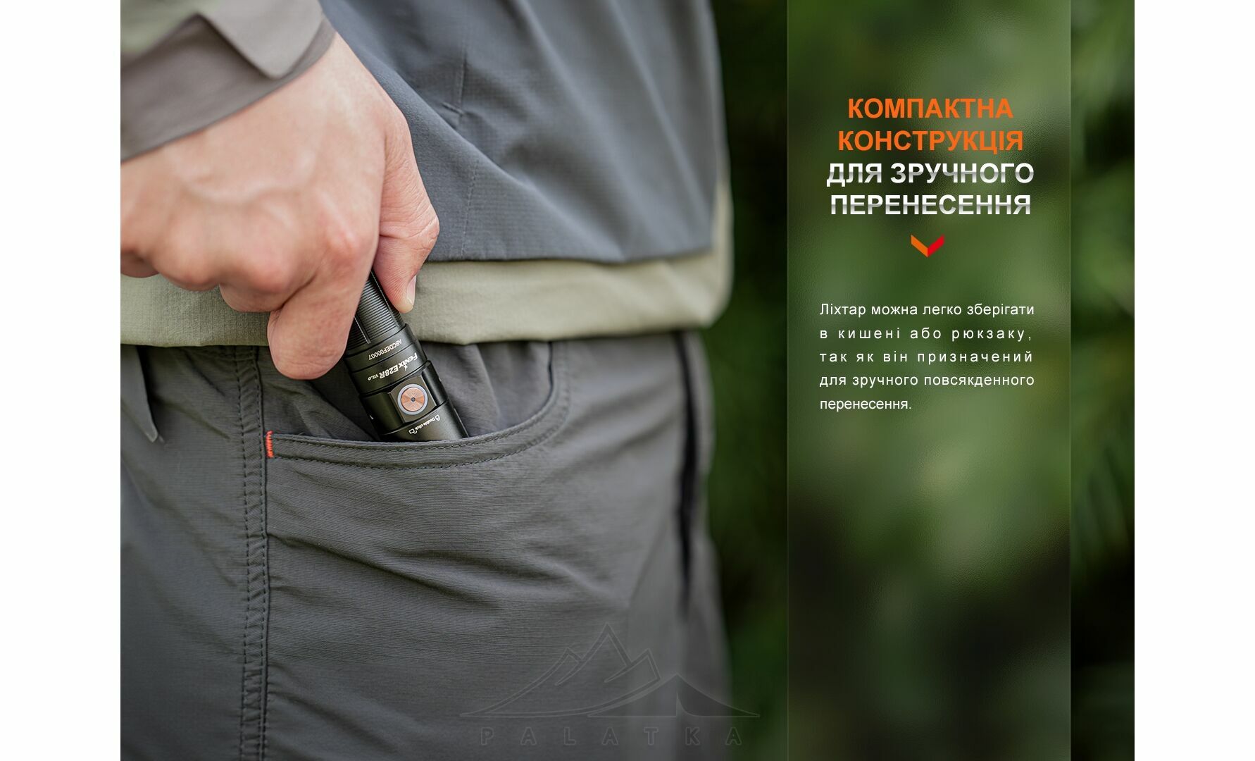 - У комплекті: акумулятор Fenix ARB-L18-3400 (3400 mAh), кабель USB Type-C, ліхтар, темляк, ущільнювальне кільце — базова комплектація для старту користування.