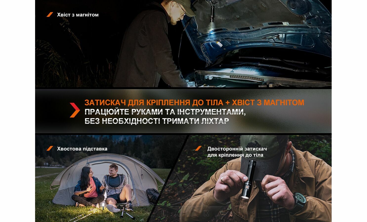- Двостороння кліпса — зручно носити в кишені та гнучко фіксувати на спорядженні.