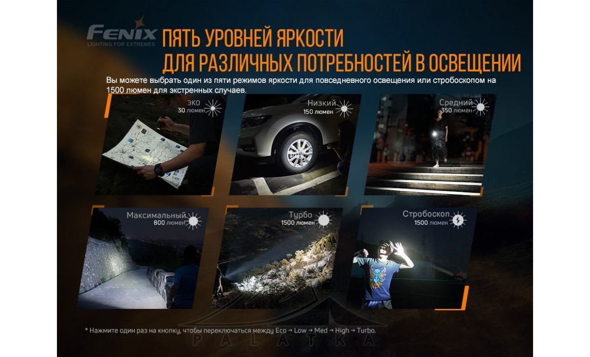 - Працює у 6 режимах – 5 режимів білого світла та строб.