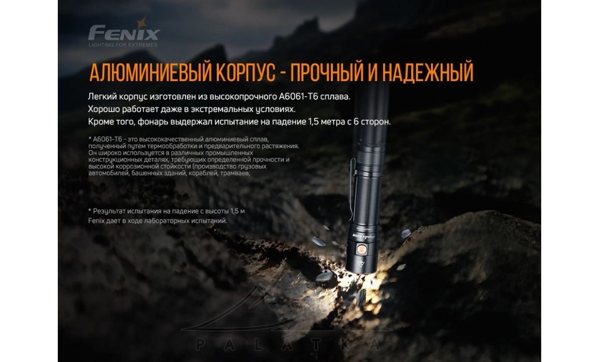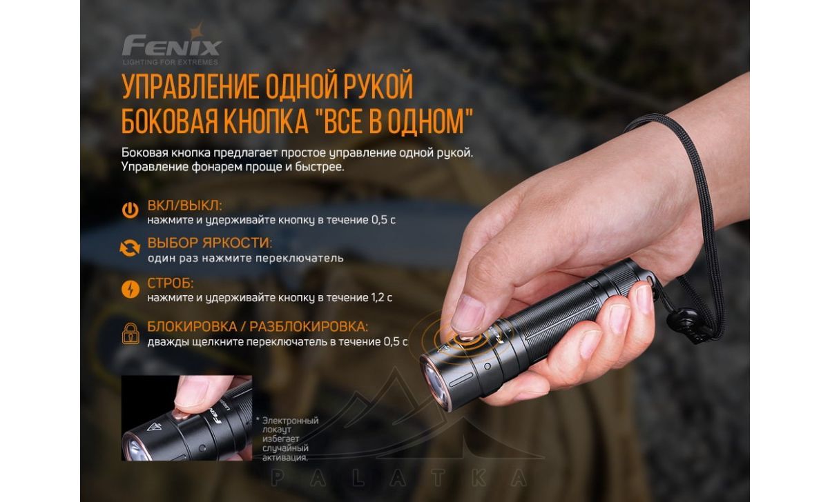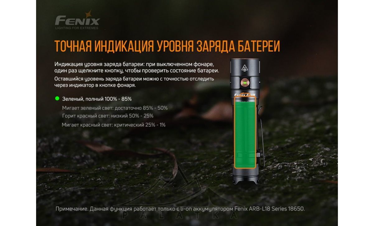 - Живлення від одного акумулятору типу 18650 (акумулятор Fenix ARB-L18-3400 входить у комплект) або від двох батарей CR123A (не входять у комплект).