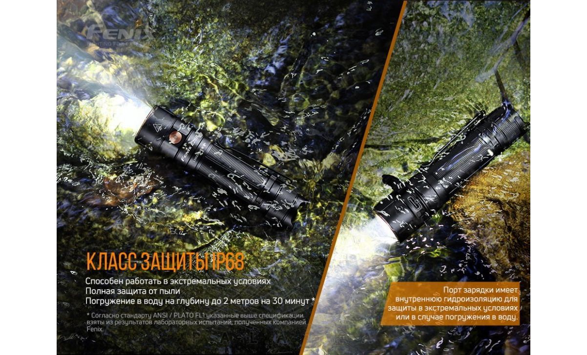 - Ступінь захисту IP68 забезпечує захист від пилу, бруду та піску та водонепроникність – ліхтар може працювати на глибині 2 м під водою протягом 30 хвилин.