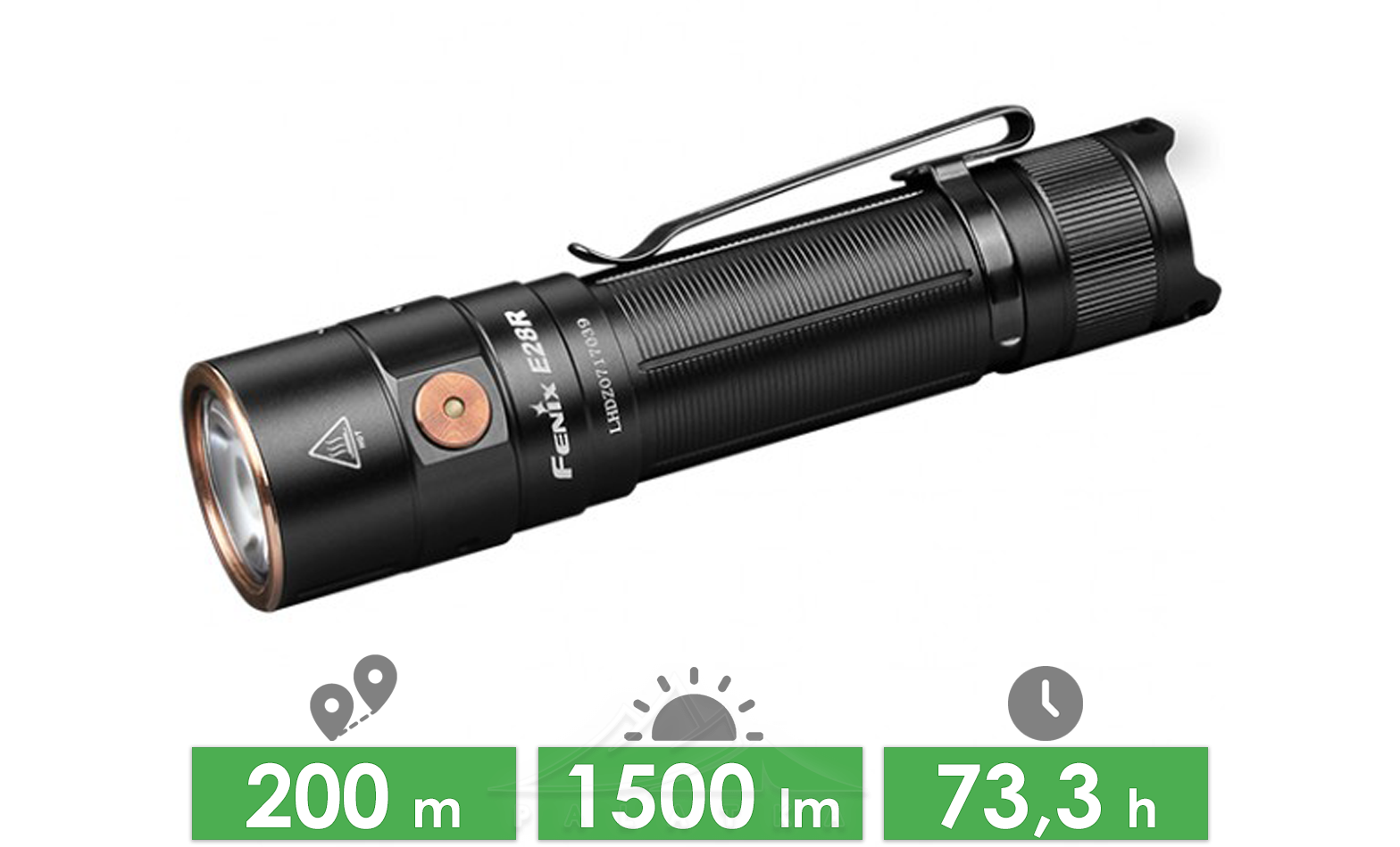 - Використовує світлодіод Luminus SST40 (холодне біле світло) із терміном служби до 50 000 годин, максимальною яскравістю 1500 люменів і дальність променя 200 метрів.