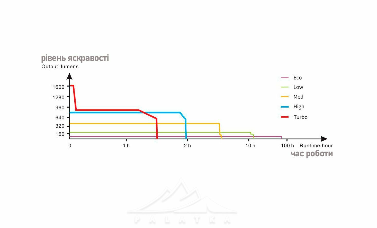 - Turbo: яcкравість - 1600 lm, час роботи - 1 г 30 хв, дальність - 146 м