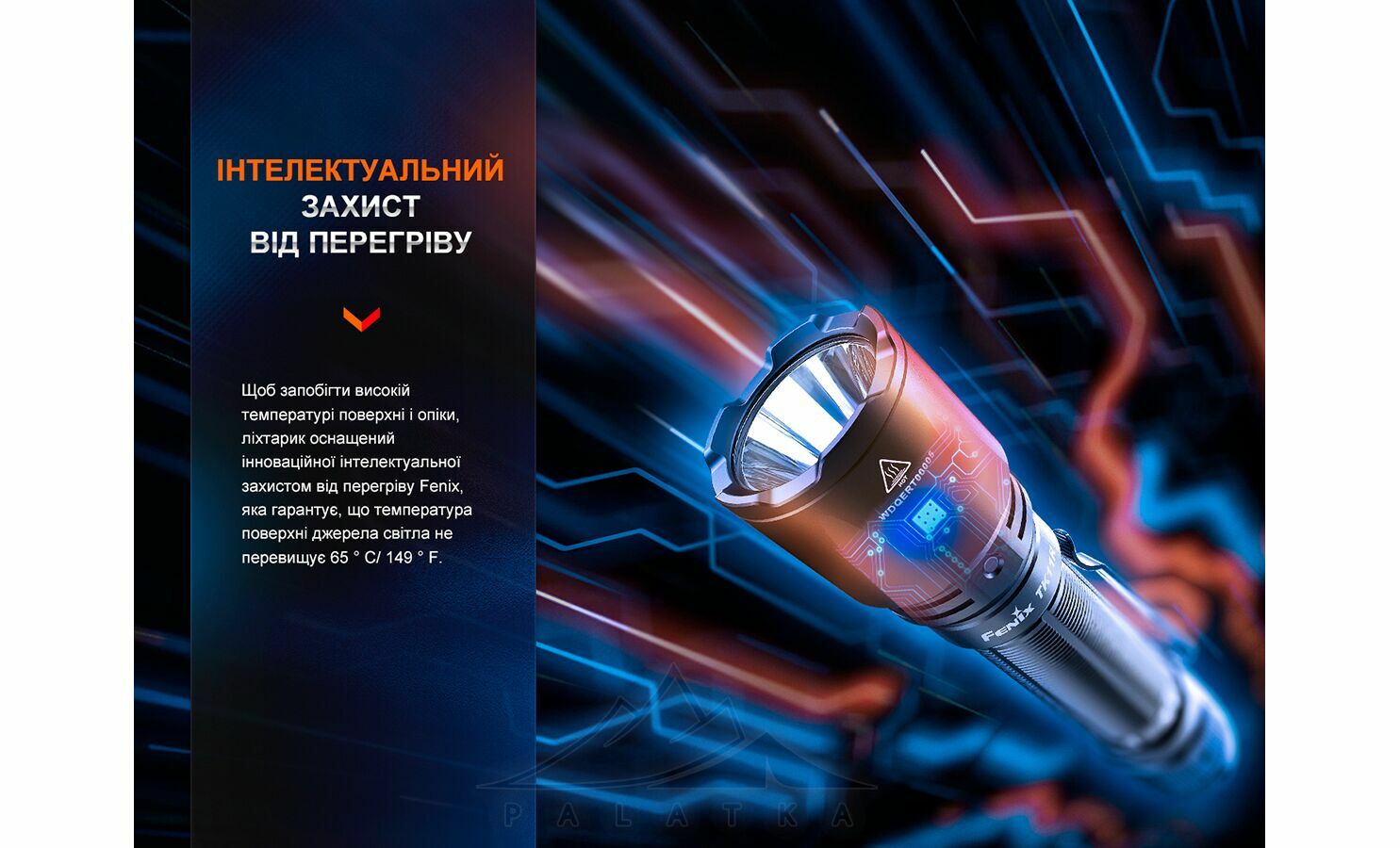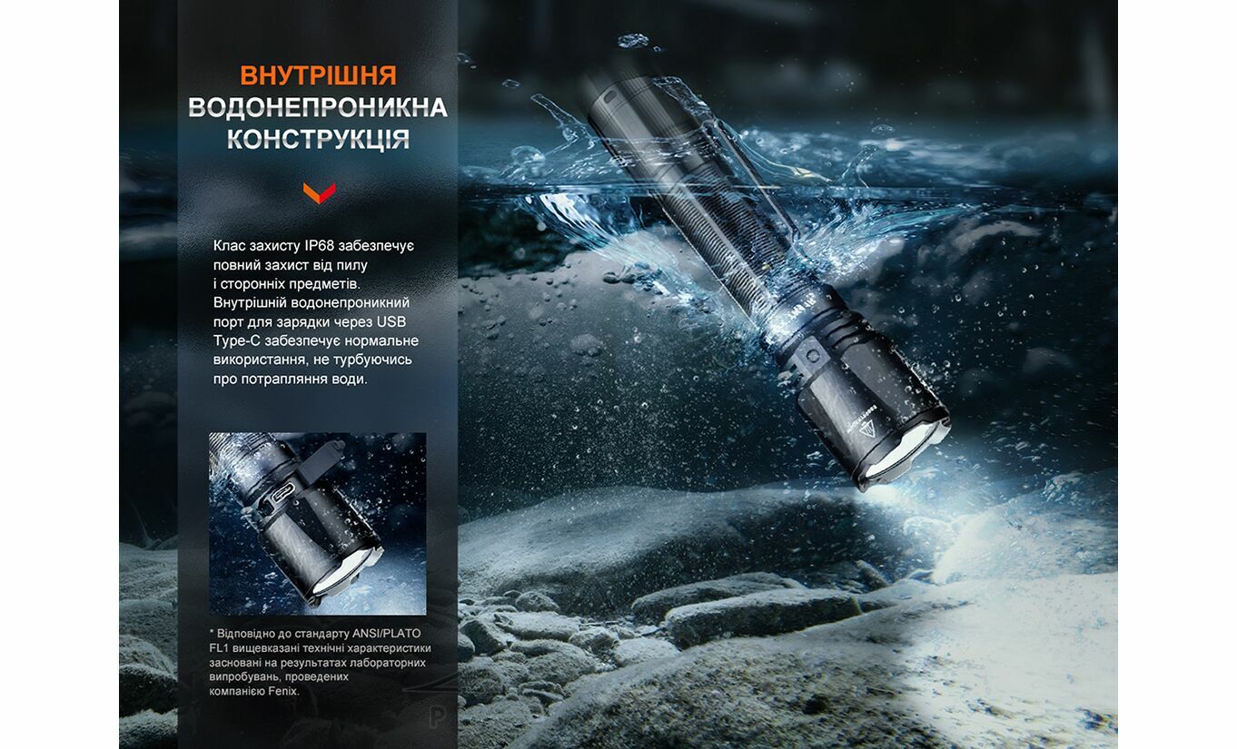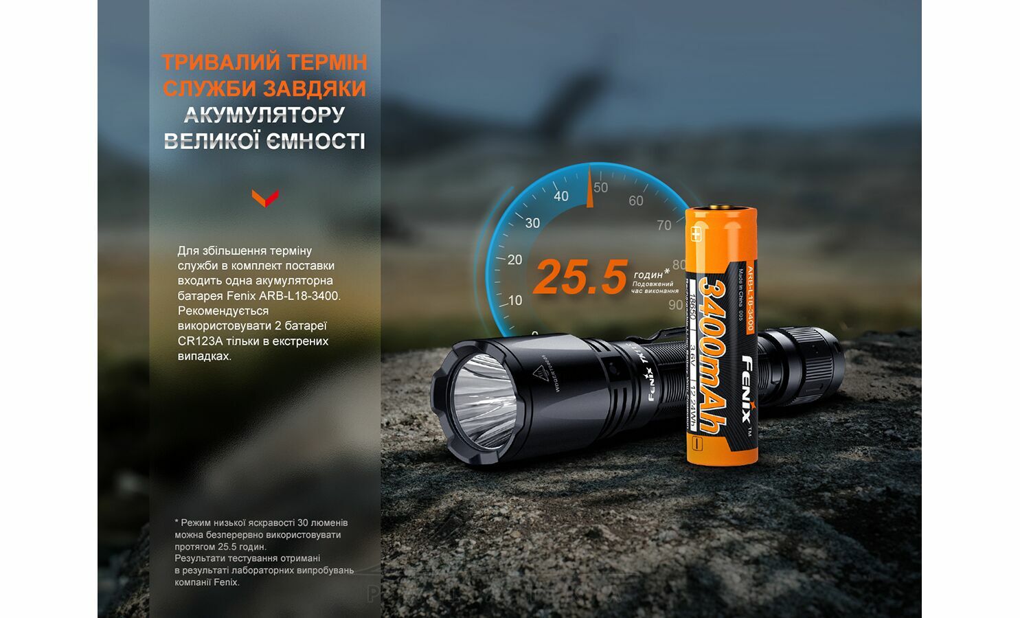 - У комплекті: акумулятор Fenix ARB-L18-3400 (3400 mAh), кабель USB Type-C, ліхтар, темляк, ущільнювальне кільце, чохол — повна базова комплектація для старту користування.