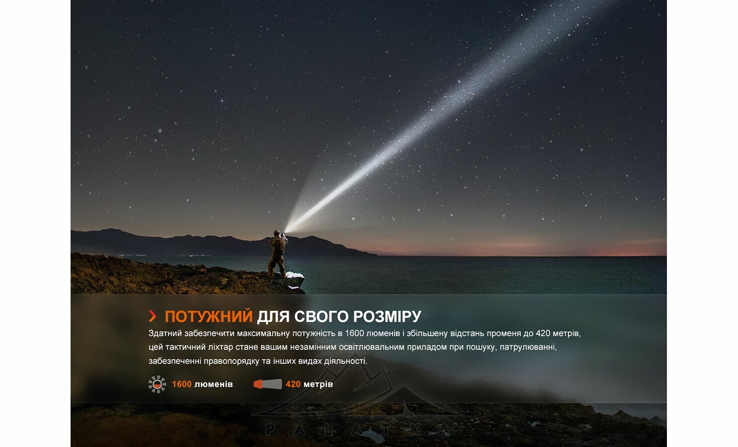 - Максимальна яскравість 1600 люмен — потужного світла достатньо для впевненого огляду території та роботи на дистанції.