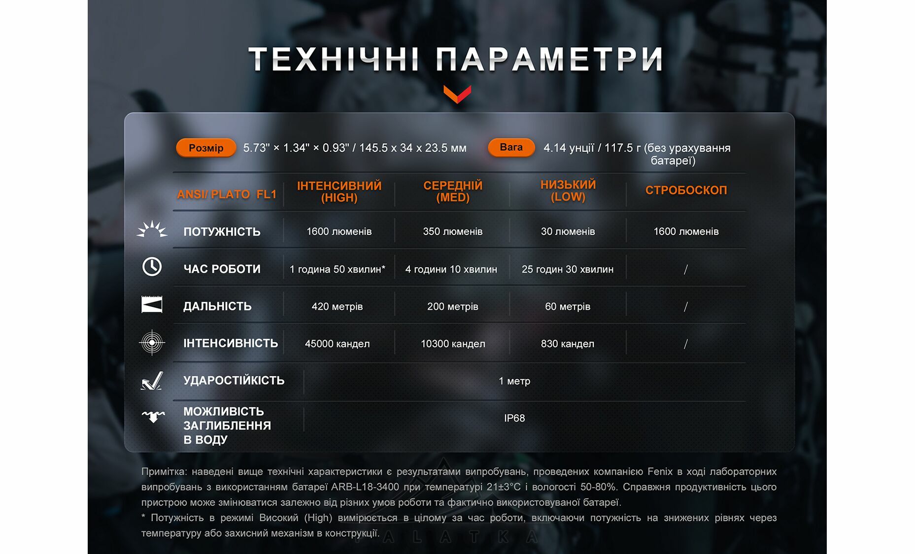 - Розміри 14,55x3,4x2,35 см, вага 117,5 г — збалансований формат для тактичного ліхтаря з хорошою дальністю.